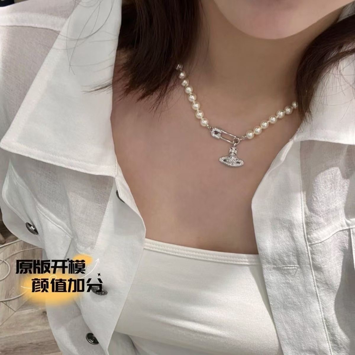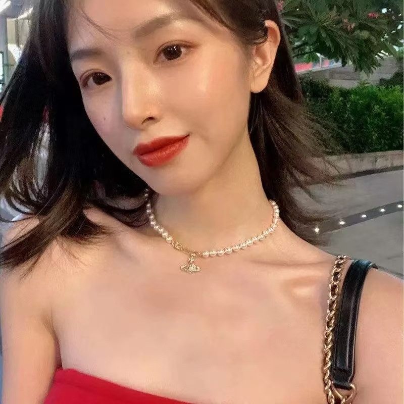 [True Same Edition] Empress Dowager Saturn Pin Pearl Necklace Women's High-value Elegant Shining Spice Girl Clavicle Chain