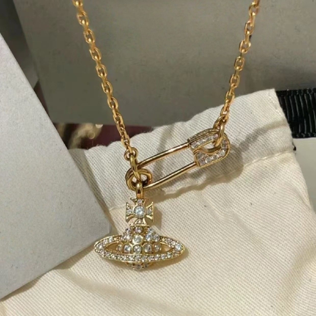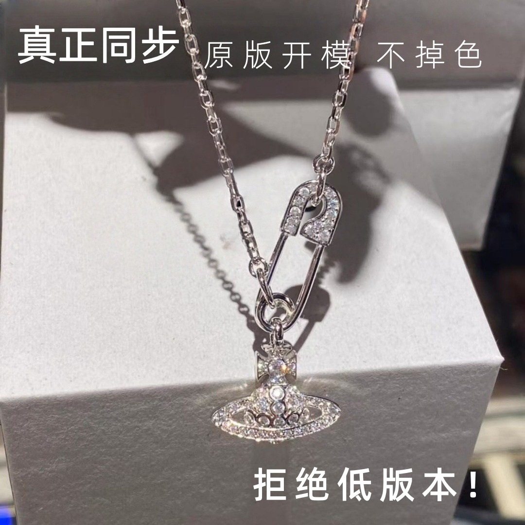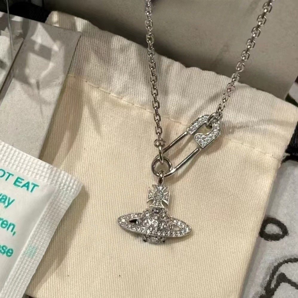[Cabinet-Grade Quality] Queen Mother Does Not Fade Full Diamond Pin Chain Saturn Necklace Women's Paper Clip Clavicle Chain Trendy