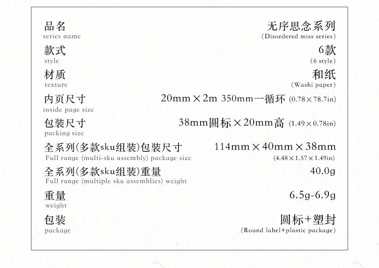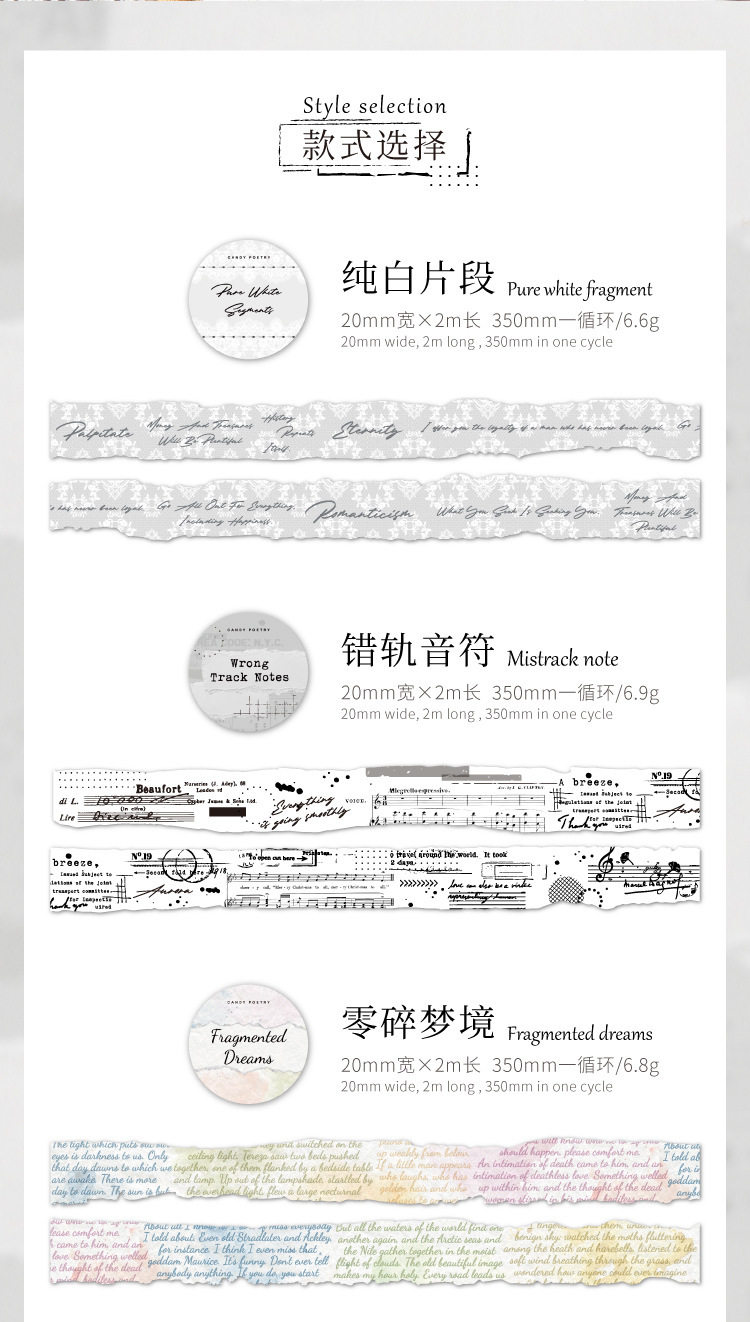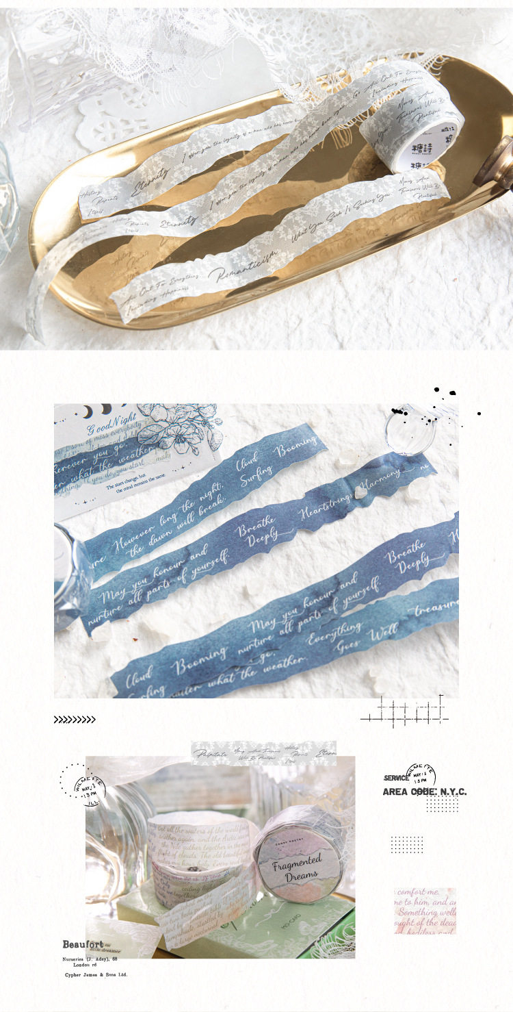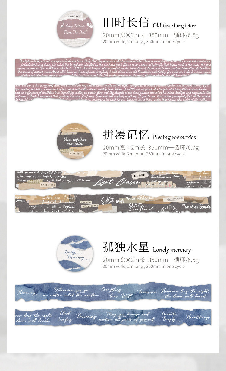 | Color | Lonely mercury 20mm*2m,Pure white film section 20mm*2m,Patchwork memory 20mm*2m,Crushed dream 20mm*2m,Old time letter 20mm*2m,Wrong track note 20mm*2m |