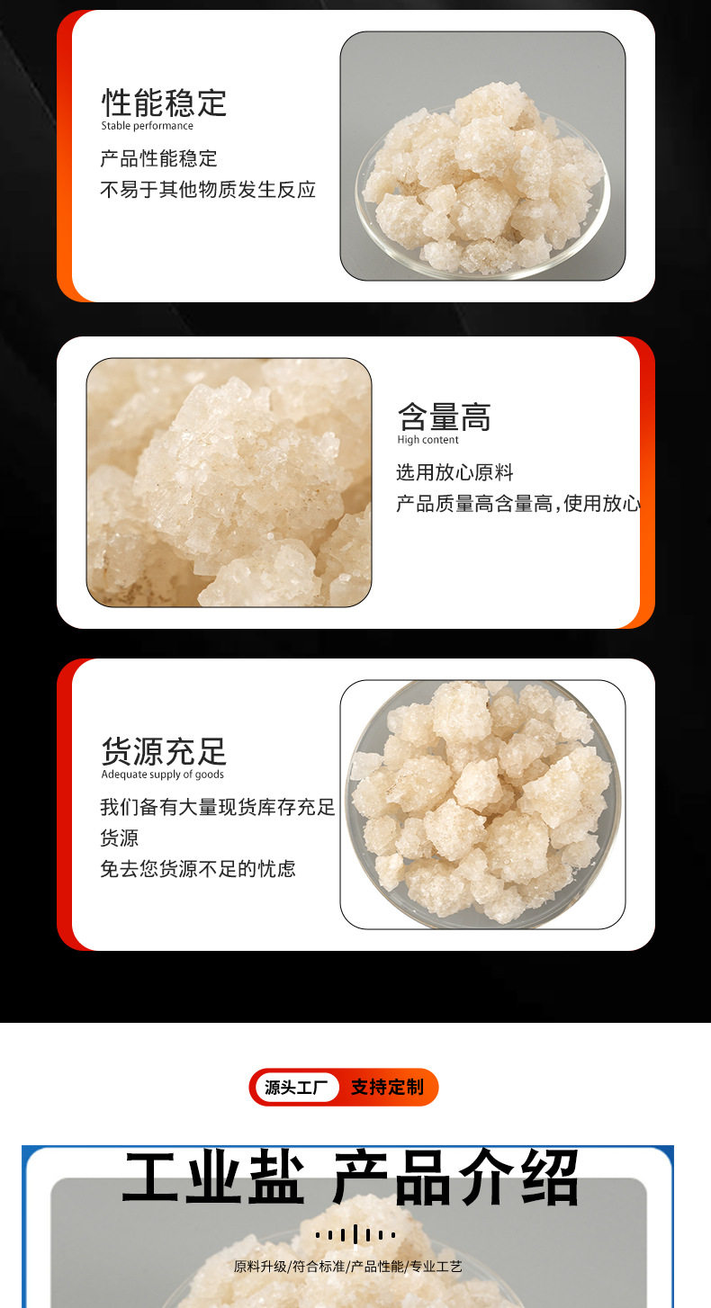 | Packaging specifications | Small white salt,Large Granules,Sea crystal salt,Soft water salt,Refined industrial salt,Feed salt (added bricks for cattle and sheep) |