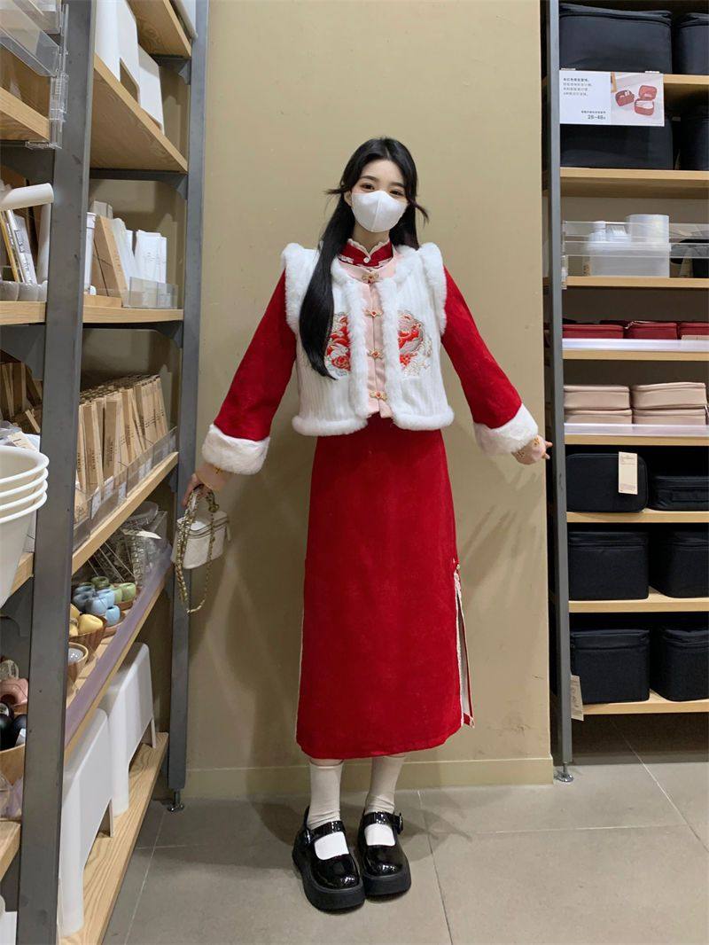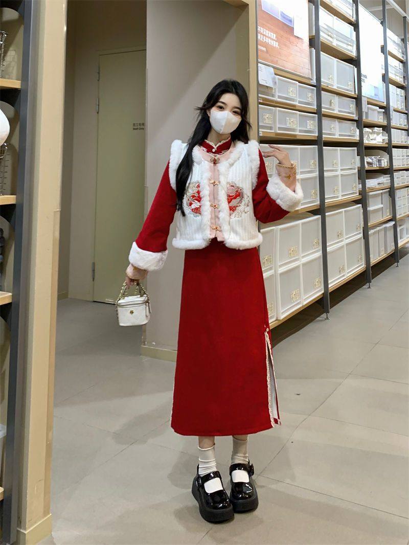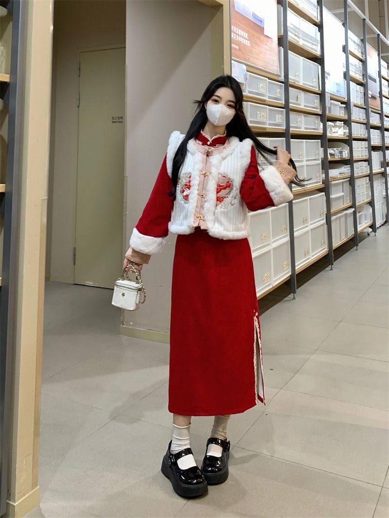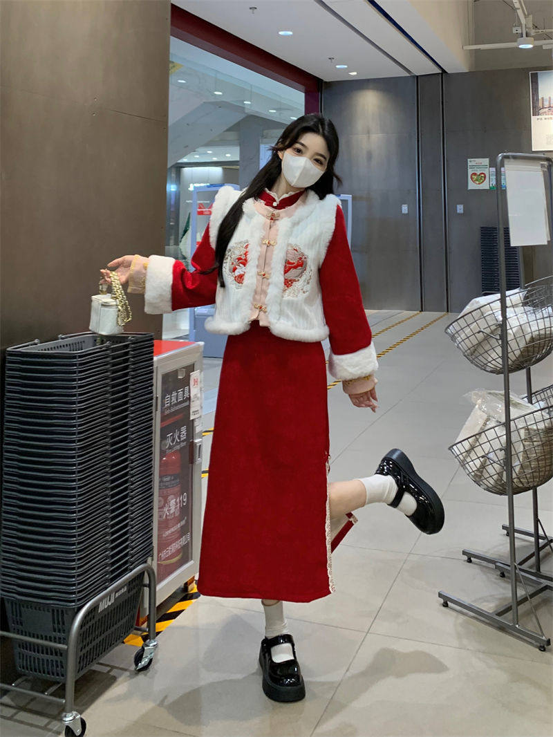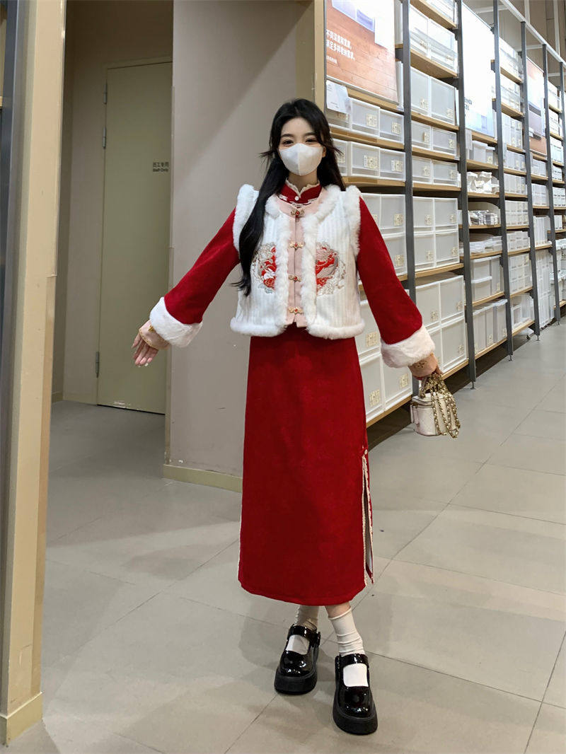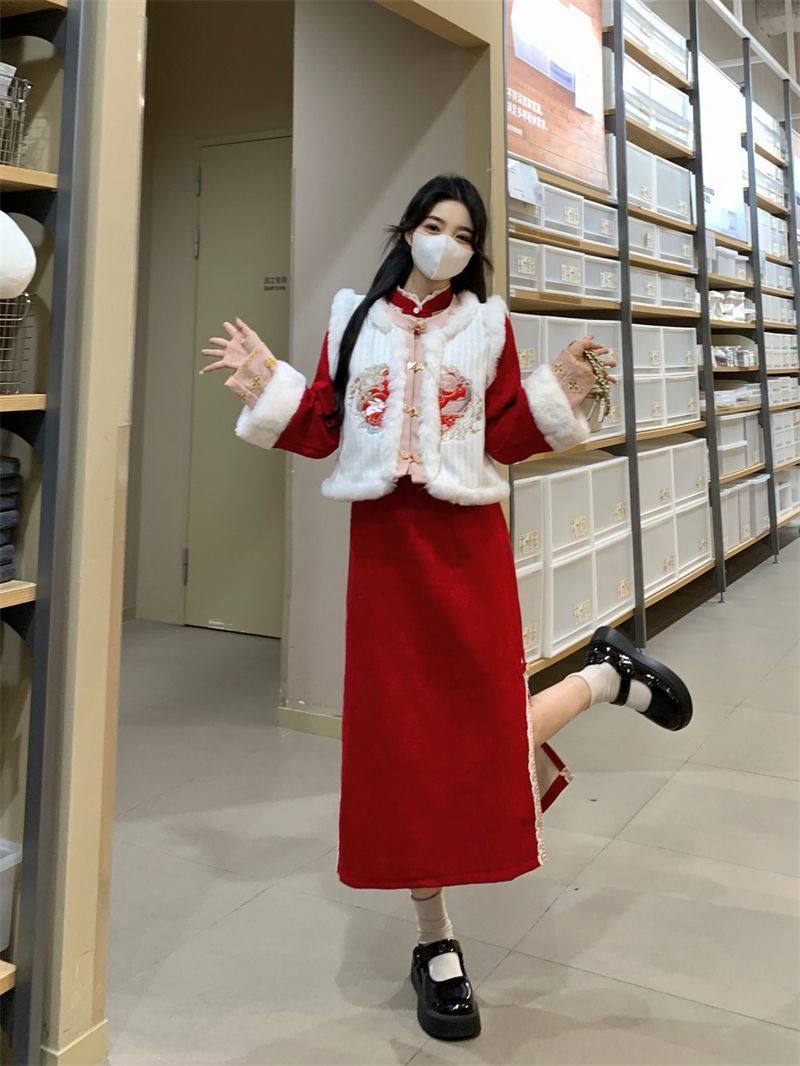 plus size Chubby mm2023 Winter New New Chinese Vest Women's Giant Skinny Red Cheongsam dress suit