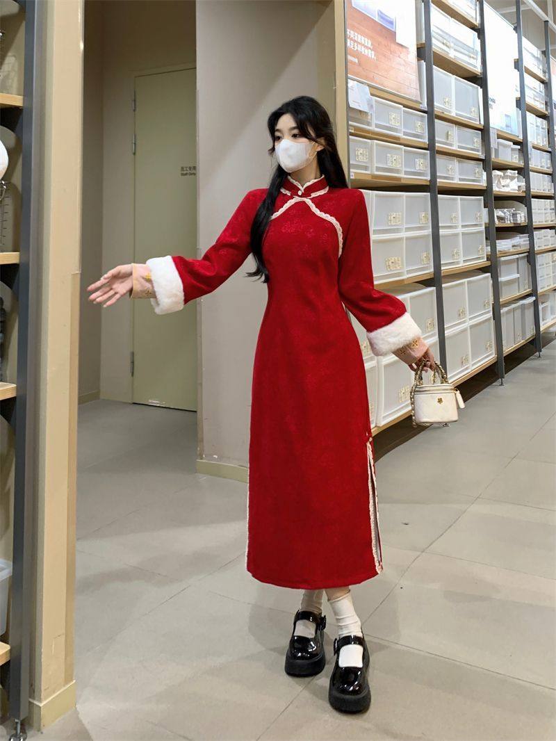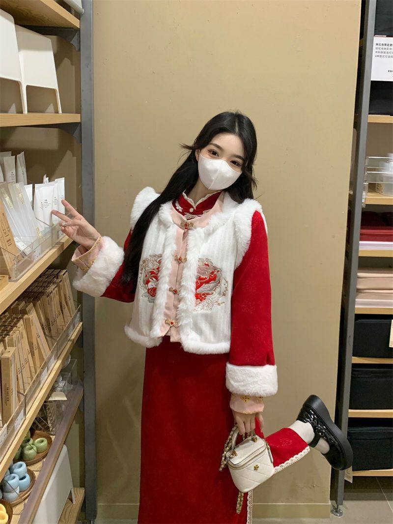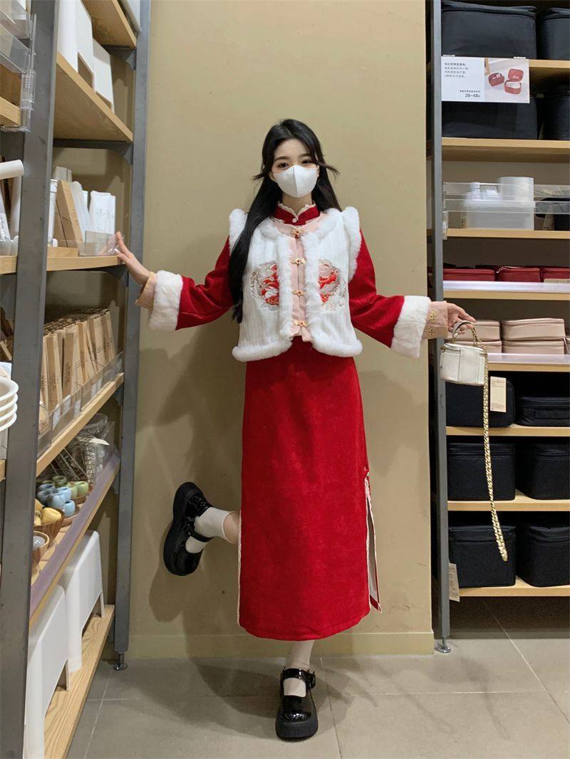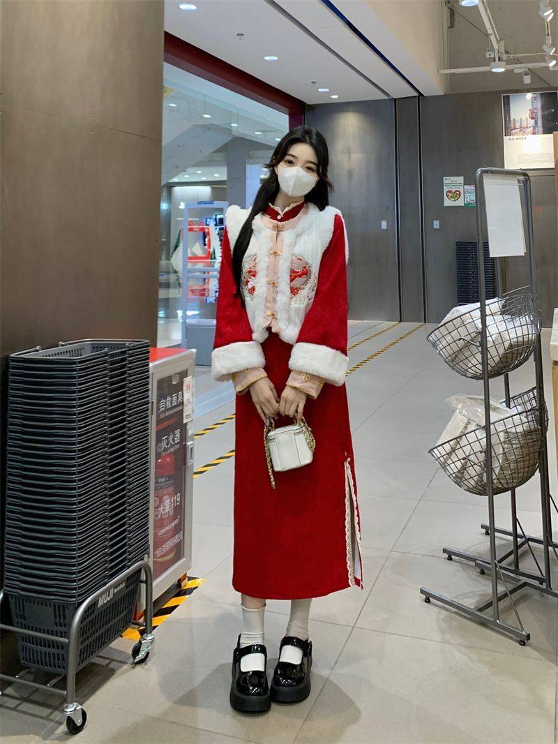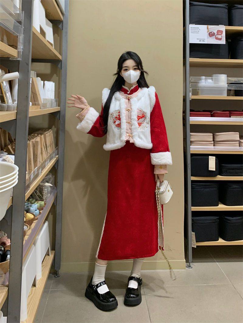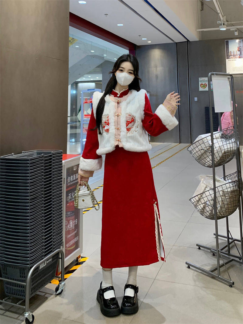 plus size Chubby mm2023 Winter New New Chinese Vest Women's Giant Skinny Red Cheongsam dress suit