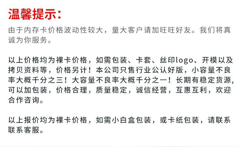 | Capacity | Please inquire for price grids of different capacities of 128m-256gb |