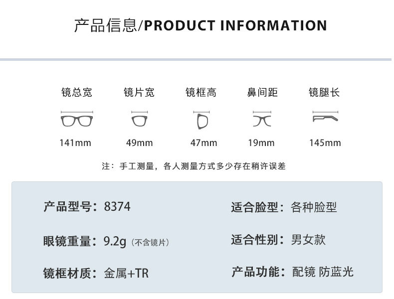 | Frame color | Black silver frame,Transparent olive green,Transparent tea frame,Transparent gray frame,Gradual gray tea,Purple on top and orange on bottom |