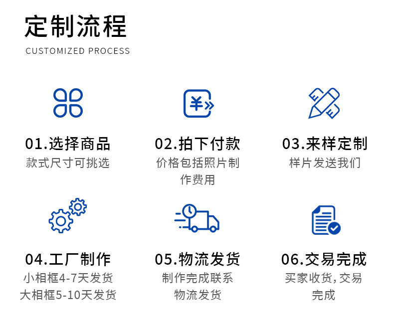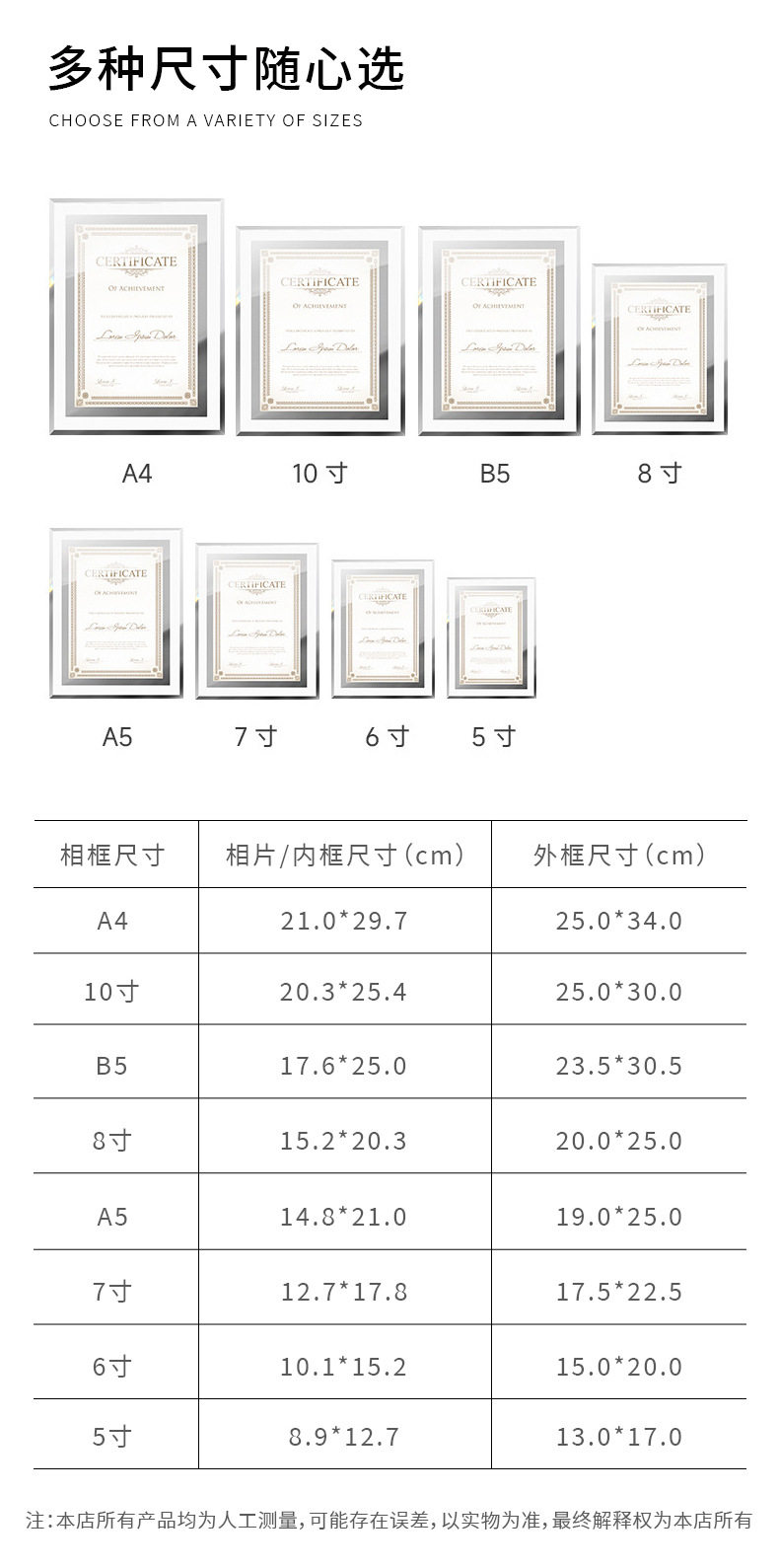 | Frame size | 5inch 8.9*12.7cm,6inch 10.1*15.2cm,7inch 12.7*17.8cm,8inch 15.2*20.3cm,10inch 20.3*25.4cm,A4 21*29.7CM,A5 18.7*25CM |