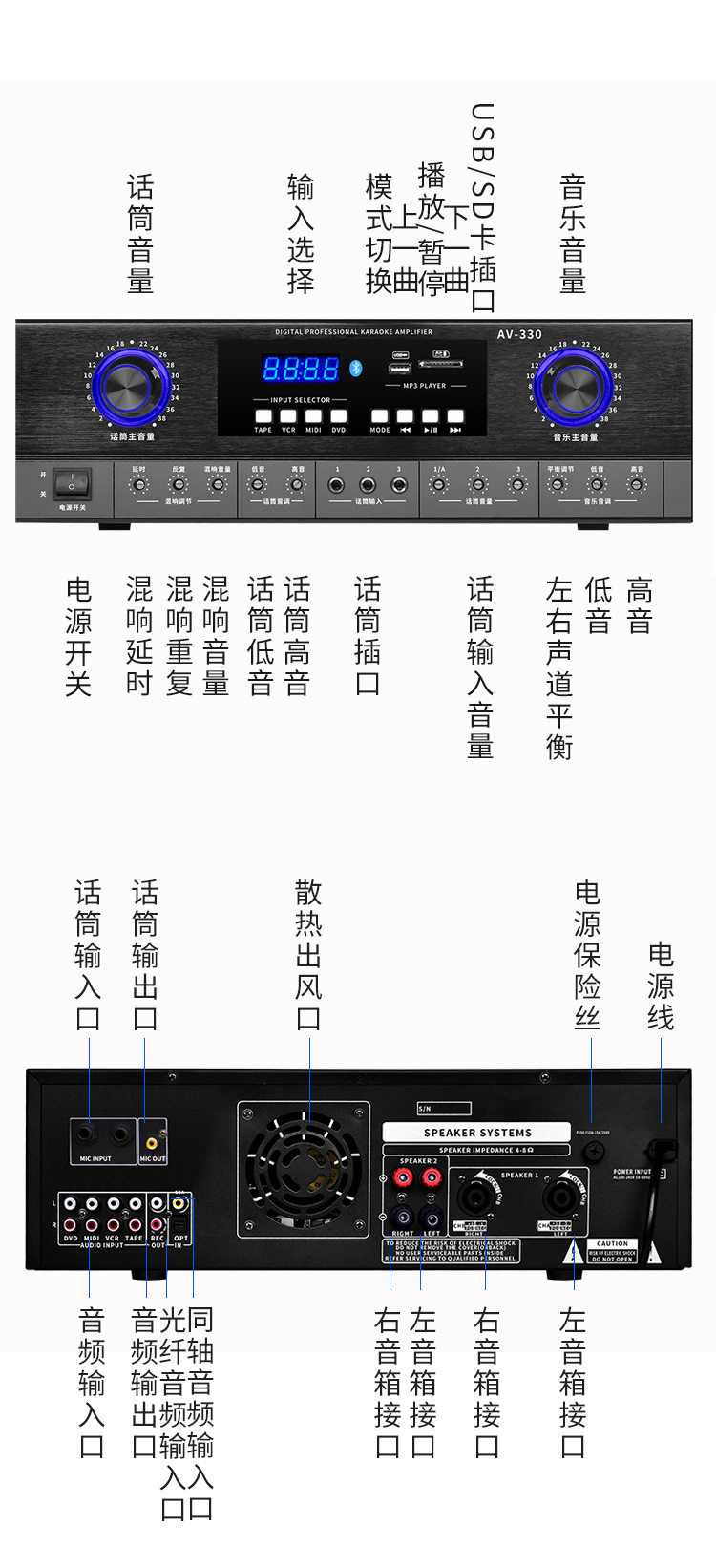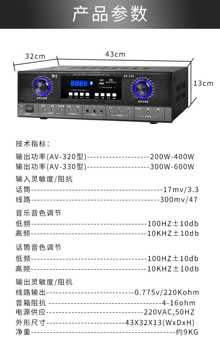 | Product specifications | AV-320(200W+200W),AV-330(300W+300W),KA-5100(200W+200W),KA-5200(300W+300W),KA-6300(350W+350W) |