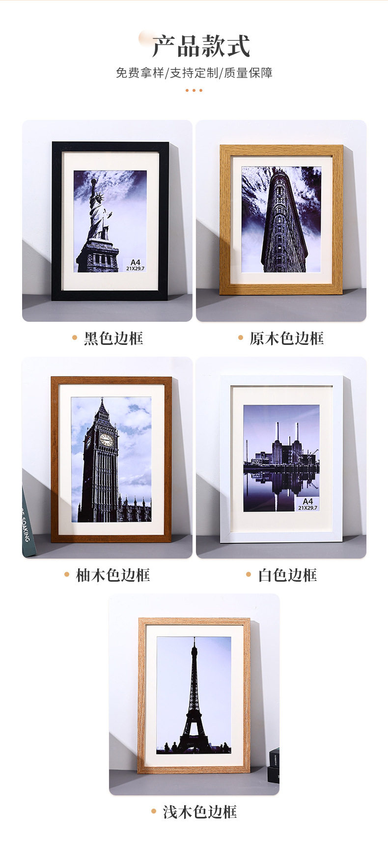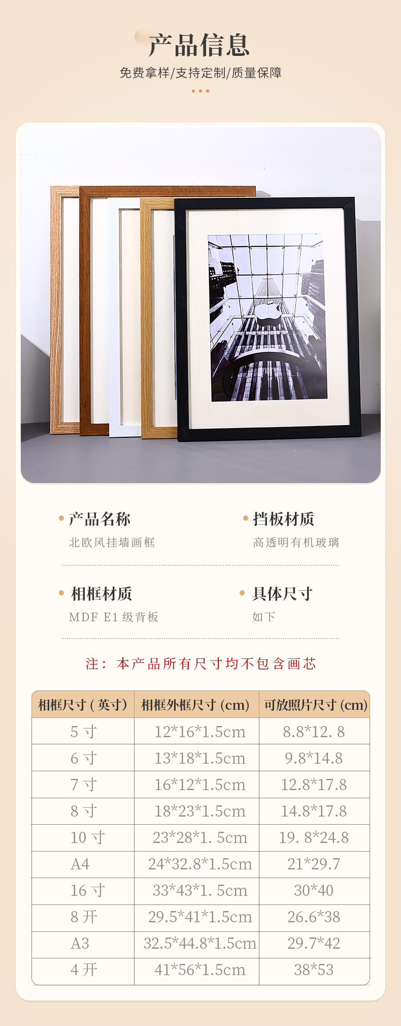 | Frame size | 5inch inner diameter (9*13) cm,6inch inner diameter (10*15)cm,7inch inner diameter (13*18)cm,8inch inner diameter (15*20) cm,10inch inner diameter (20*25) cm,A4 inner diameter (21*29.7) cm,A3 inner diameter (29.7*42) cm,16inch inner diameter (30*40) cm,8k inner diameter (26.5*38) cm,4k inner diameter (38*53) cm |