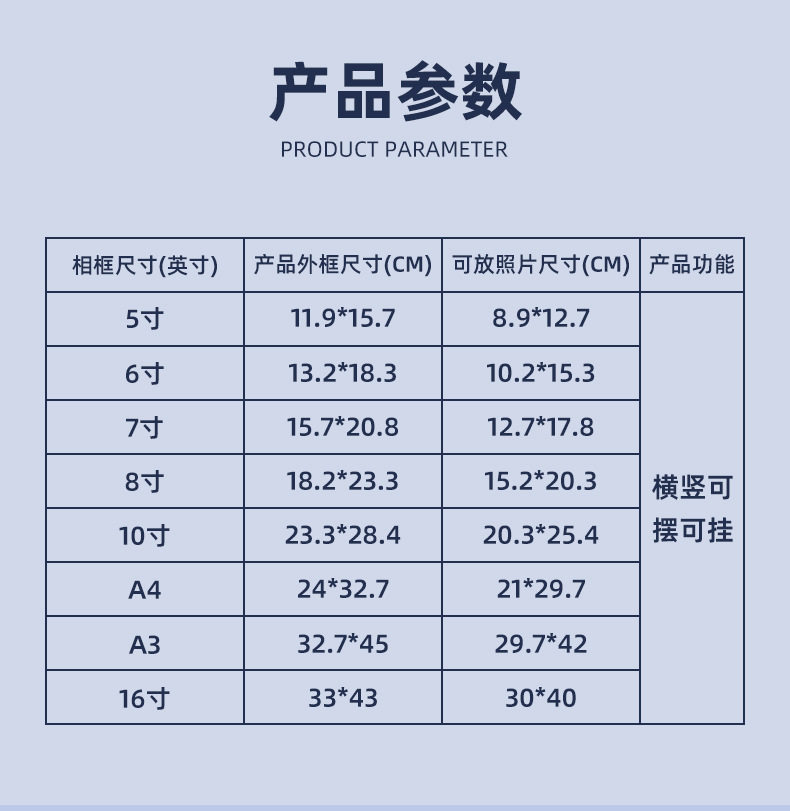 | Frame size | 5inch (inner diameter 9*13) can be hung or placed,6inch (inner diameter 10.2*15.2) can be hung or placed,7inch (inner diameter 12.7*17.8) can be hung or placed,8inch (inner diameter 15.2*20.3) can be hung or placed,10inch (inner diameter 20.3*25.3) can be hung or placed,A4 (inner diameter 21*29.7) can be hung or placed |