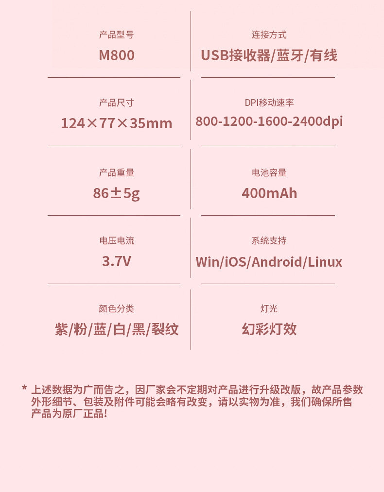 | Specifications | Basic version 3 keys-single mode-1600dpi-vitality powder,Basic version 3 keys-single mode-1600dpi-sianhe blue,Basic version 3-button-single mode-1600dpi-cool black,Basic version 3-button-single mode-1600dpi-ivory white,Upgraded version 7-key-single mode-2400dpi-rgb light-vitality powder,Upgraded version 7-key-single mode-2400dpi-rgb light-sky river blue,Upgraded version 7-key-single mode-2400dpi-rgb light-cool black,Upgraded version 7-key-single mode-2400dpi-rgb light-ivory white,Upgraded version 7-key-single mode-2400dpi-rgb light-electroplating purple,Upgraded version 7-key-single mode-2400dpi-rgb light-crack powder,Upgraded version 7-key-single mode-2400dpi-rgb light-crack blue,Upgraded version 7-key-single mode-2400dpi-rgb light-crack black,Upgraded version 7-key-single mode-2400dpi-rgb light-crack white,Ultimate 7-key-dual-mode-2400dpi-rgb light-one-click return to desktop-vitality powder,Ultimate 7-key-dual-mode-2400dpi-rgb light-one-click return to desktop-sky river blue,Ultimate 7-key-dual-mode-2400dpi-rgb light-one-click return to desktop-cool black,Ultimate 7-key-dual-mode-2400dpi-rgb light-one-click return to desktop-ivory white,Ultimate 7-key-dual-mode-2400dpi-rgb light-one-click return to desktop-electroplating purple,Ultimate 7-key-dual-mode-2400dpi-rgb light-one-click return to desktop-crack powder,Ultimate 7-key-dual-mode-2400dpi-rgb light-one-click return to desktop-crack blue,Ultimate 7-key-dual-mode-2400dpi-rgb light-one-click return to desktop-crack black,Ultimate 7-key-dual-mode-2400dpi-rgb light-one-click return to desktop-crack white,Battery level indicator version 7 keys-single mode-2400dpi-rgb light-vitality powder,Battery level indicator version 7 keys-single mode-2400dpi-rgb light-sky river blue,Battery level indicator version 7 keys-single mode-2400dpi-rgb light-cool black,Battery level indicator version 7 keys-single mode-2400dpi-rgb light-ivory white,Battery level indicator version 7 keys-single mode-2400dpi-rgb light-electroplating purple,Battery level indicator version 7 keys-dual mode-2400dpi-rgb light-one key return to desktop-vitality pink,Battery level indicator version 7 keys-dual mode-2400dpi-rgb light-one key return to desktop-sky river blue,Battery level indicator version 7 keys-dual mode-2400dpi-rgb light-one key return to desktop-cool black,Battery level indicator version 7 keys-dual mode-2400dpi-rgb light-one key return to desktop-ivory white,Battery level indicator version 7 keys-dual mode-2400dpi-rgb light-one key return to desktop-electroplating purple,Ultimate version 7-key-wired-bluetooth-wireless three-mode-2400dpi-vitality powder,Ultimate version 7-key-wired-bluetooth-wireless three-mode-2400dpi-sianhe blue,Ultimate version 7-key-wired-bluetooth-wireless three-mode-2400dpi-cool black,Ultimate version 7-key-wired-bluetooth-wireless three-mode-2400dpi-ivory white,Ultimate version 7-key-wired-bluetooth-wireless three-mode-2400dpi-electroplating purple,Screen digital display - dpi gear display - power digital display - bluetooth wired wireless three-mode - vitality powder,Screen digital display - dpi gear display - power digital display - bluetooth wired wireless three-mode - cool black |