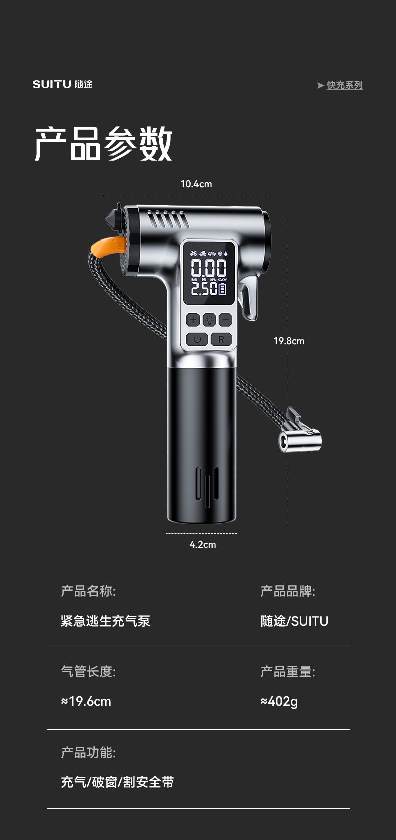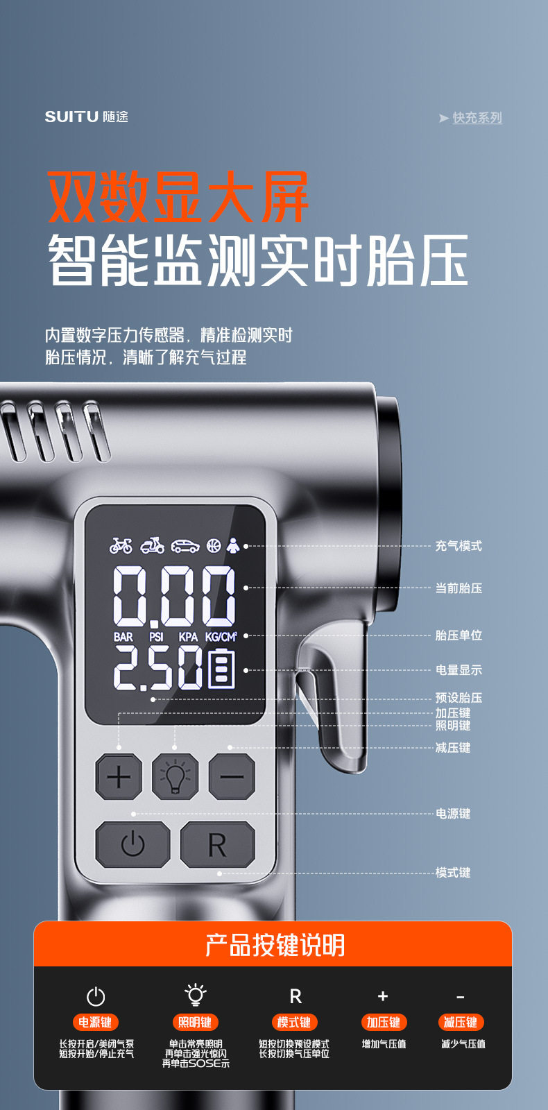 | Additional features | Lighting,Tire pressure gauge,Warning light,Usb charging |