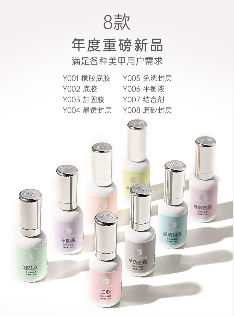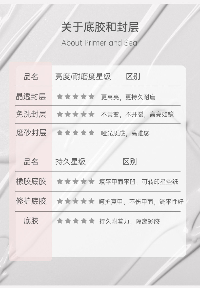 | Color | Rubber base,Primer,Reinforcement glue,Crystal clear seal,No-clean sealant,Balance fluid,Binder,Frosted seal,Nail adhesive,Magic mirror powder seal,Smudge glue,Construction glue,Non-stick powder frosted sealant,Crystal plated sealing layer,Gift【contact customer service for notes】 |