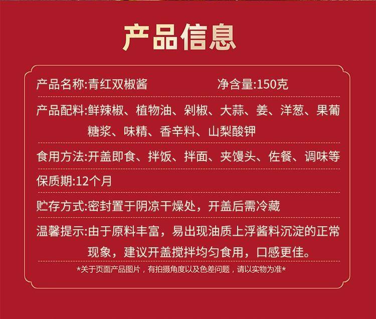 | Packaging specifications | Double pepper sauce bottle 150g |