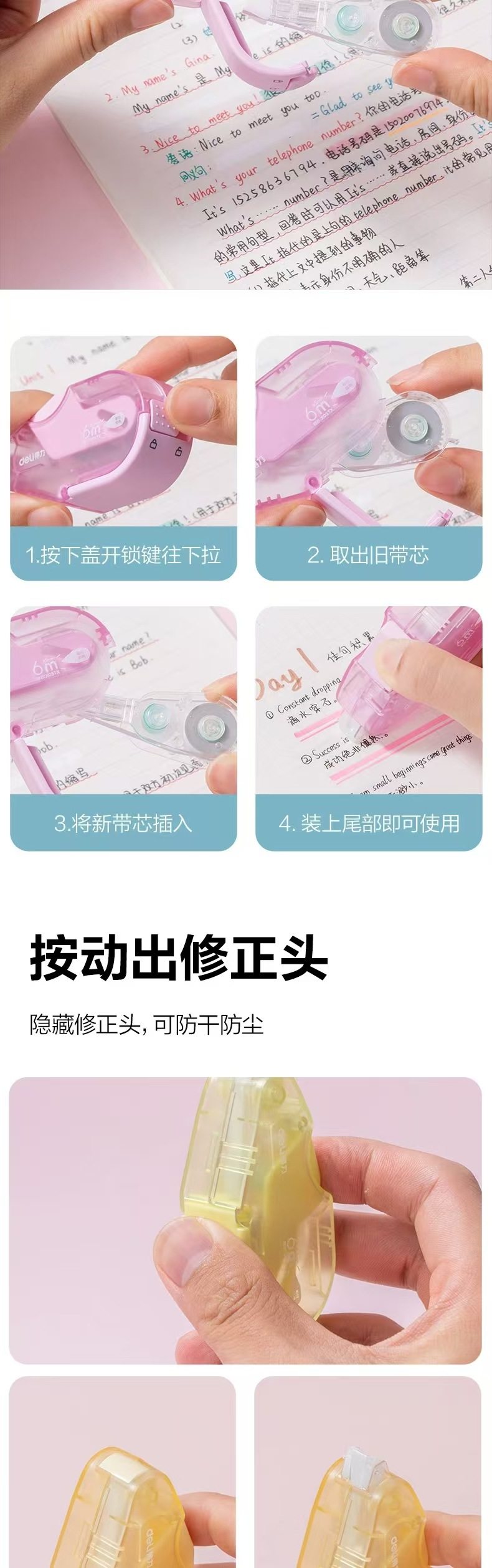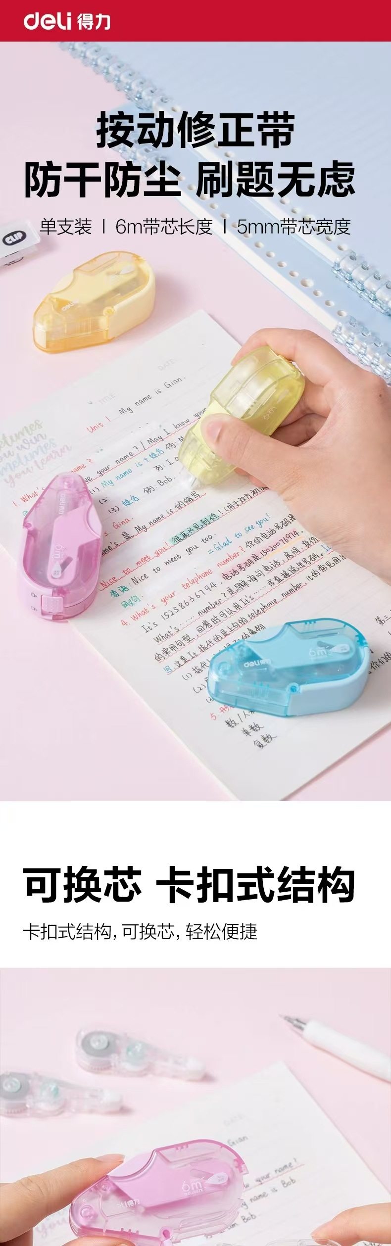 Deli correction tape press the sealed door anti-dry correction tape one-key core large-capacity correction tape correction tape wholesale