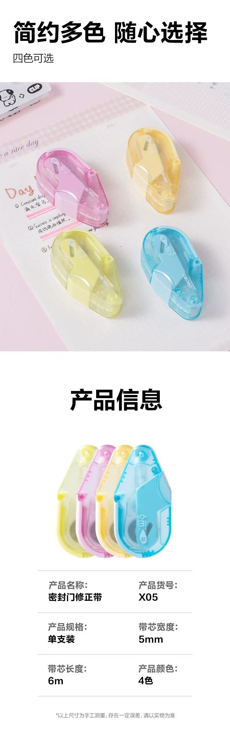 | Specification | Deli x05 push seal door correction belt 6m (mixed) (piece),Deli x06 push-seal door correction tape (mixed) (piece),Deli x07 push seal door correction tape 20m (mixed) (piece),Deli x05tx press-to-seal correction tape refill (clear) (each) |