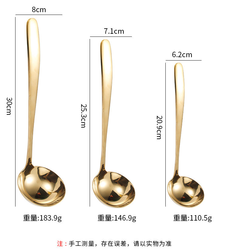 | Specifications | Gold thickened version-small spoon [6cm],Gold thickened version-small colander [6cm],Gold thickened version-large spoon [7cm],Gold thickened version-large colander [7cm],Gold thickened version-extra large spoon [8cm],Gold thickened version-extra large colander [8cm],Silver thickened version-small spoon [6cm],Silver thickened version-small colander [6cm],Silver thickened version-large spoon [7cm],Silver thickened version-large colander [7cm],Silver thickened version-extra large spoon [8cm],Silver thickened version-extra large colander [8cm] |