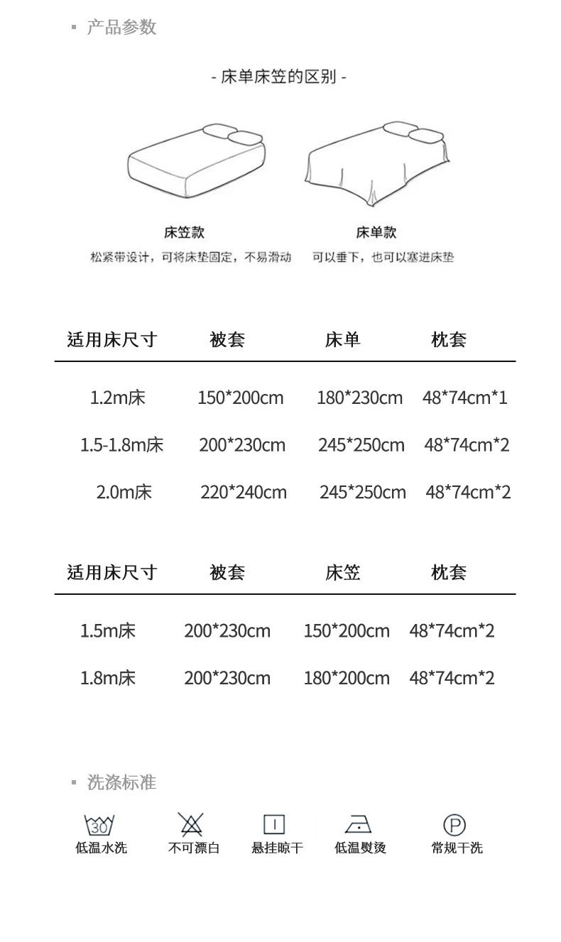 | Size specifications | 1.2m bed sheet three-piece set [quilt cover 150*200],1.5m bed sheet four-piece set [quilt cover 200*230],1.8m bed sheet four-piece set [quilt cover 200*230],2.0m bed sheet four-piece set [quilt cover 220*240],1.5m fitted sheet set of four [quilt cover 200*230],1.8m fitted sheet set of four [quilt cover 200*230] |