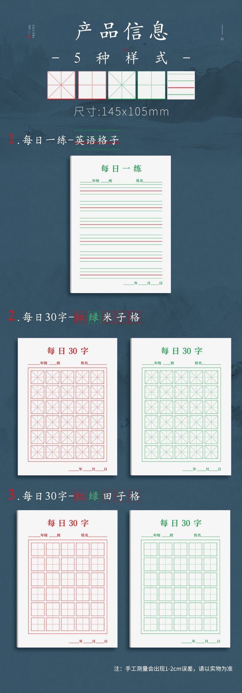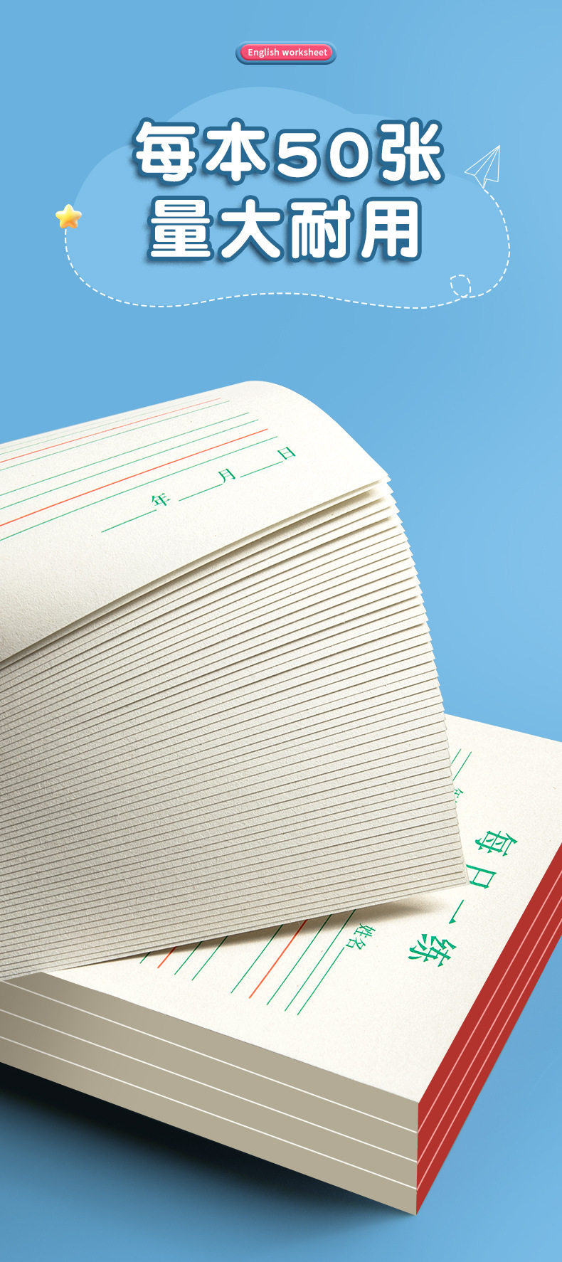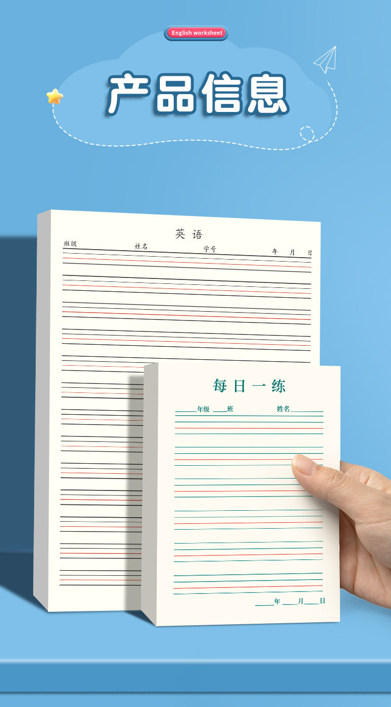 | Specifications | (english four-line grid) 1 pack/50 sheets,(green field grids) 1 pack/50 sheets,(red field grids) 1 pack/50 sheets,(green rice grids) 1 pack/50 sheets,(red rice grid) 1 pack/50 sheets,(english four-line grid) 2 packs/100 sheets in total,(english four-line grid) 3 packs/150 sheets in total,(english four-line grid) 4 volumes/total 200 sheets,(english four-line grid) 5 volumes/total 250 sheets,(english four-line grid) 10 packs/500 sheets in total,(english four-line grid) 20 packs/1000 sheets in total,(english four-line grid) 30 volumes/1500 sheets in total |