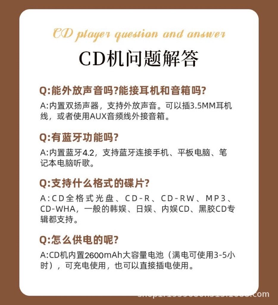| Packing list | Cd player*1 manual*1 charging cable*1 |