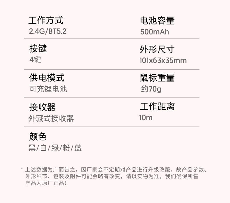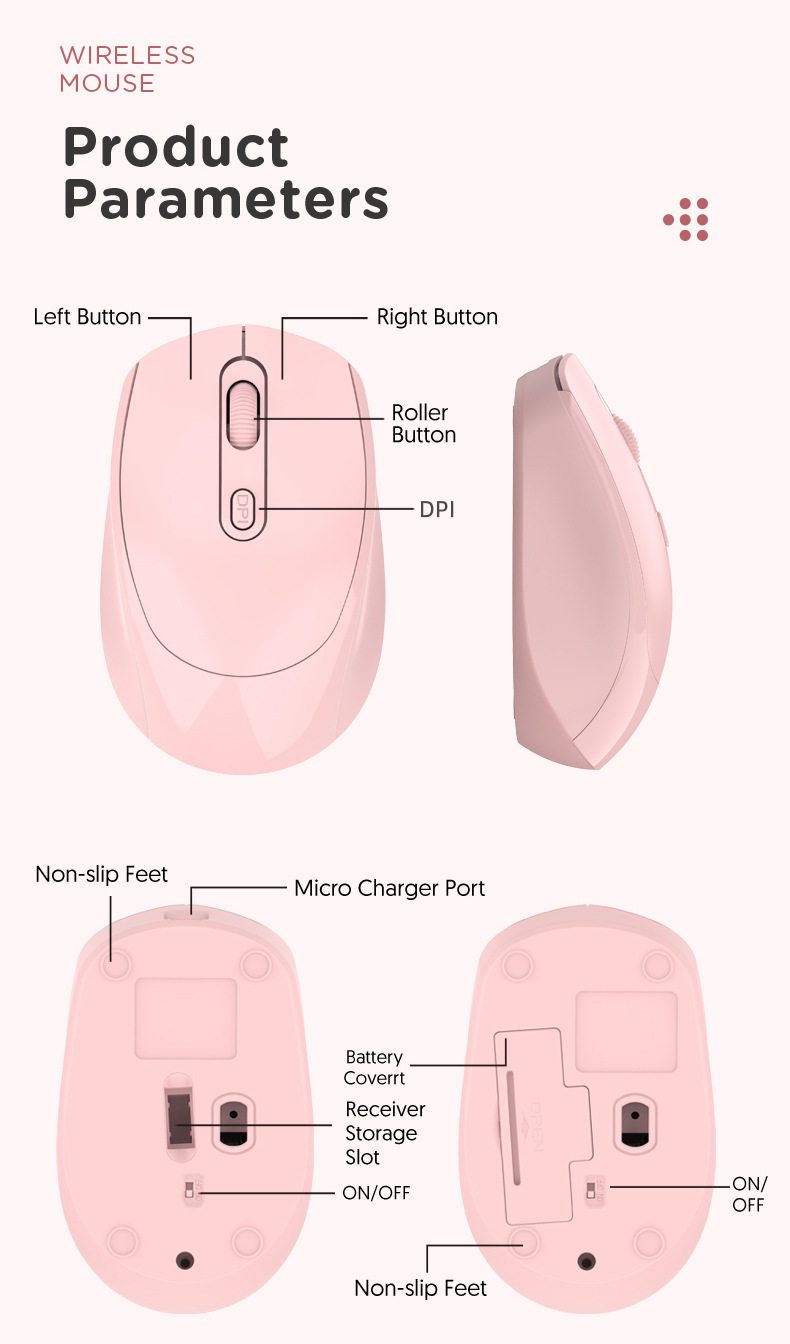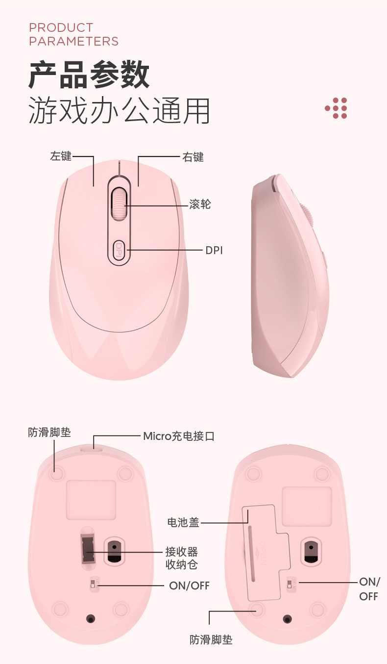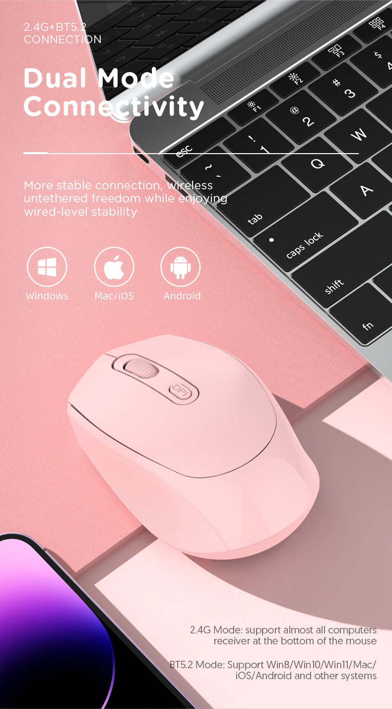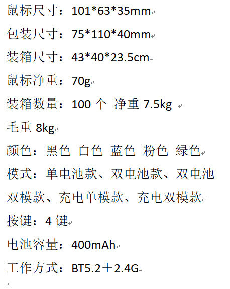 | Color | Battery model 2.4g black,Battery type 2.4g white,Battery type 2.4g blue,Battery type 2.4g pink,Battery type 2.4g green,Battery model 2.4g+bluetooth black,Battery model 2.4g+bluetooth white,Battery model 2.4g+bluetooth blue,Battery model 2.4g+bluetooth pink,Battery model 2.4g+bluetooth green,Rechargeable 2.4g single mode blue,Rechargeable 2.4g single mode black,Rechargeable 2.4g single mode pink,Rechargeable 2.4g single mode white,Rechargeable 2.4g single mode green,Charging dual mode 2.4g+bluetooth black,Charging dual mode 2.4g+bluetooth white,Charging dual mode 2.4g+bluetooth blue,Charging dual mode 2.4g+bluetooth pink,Charging dual mode 2.4g+bluetooth green |