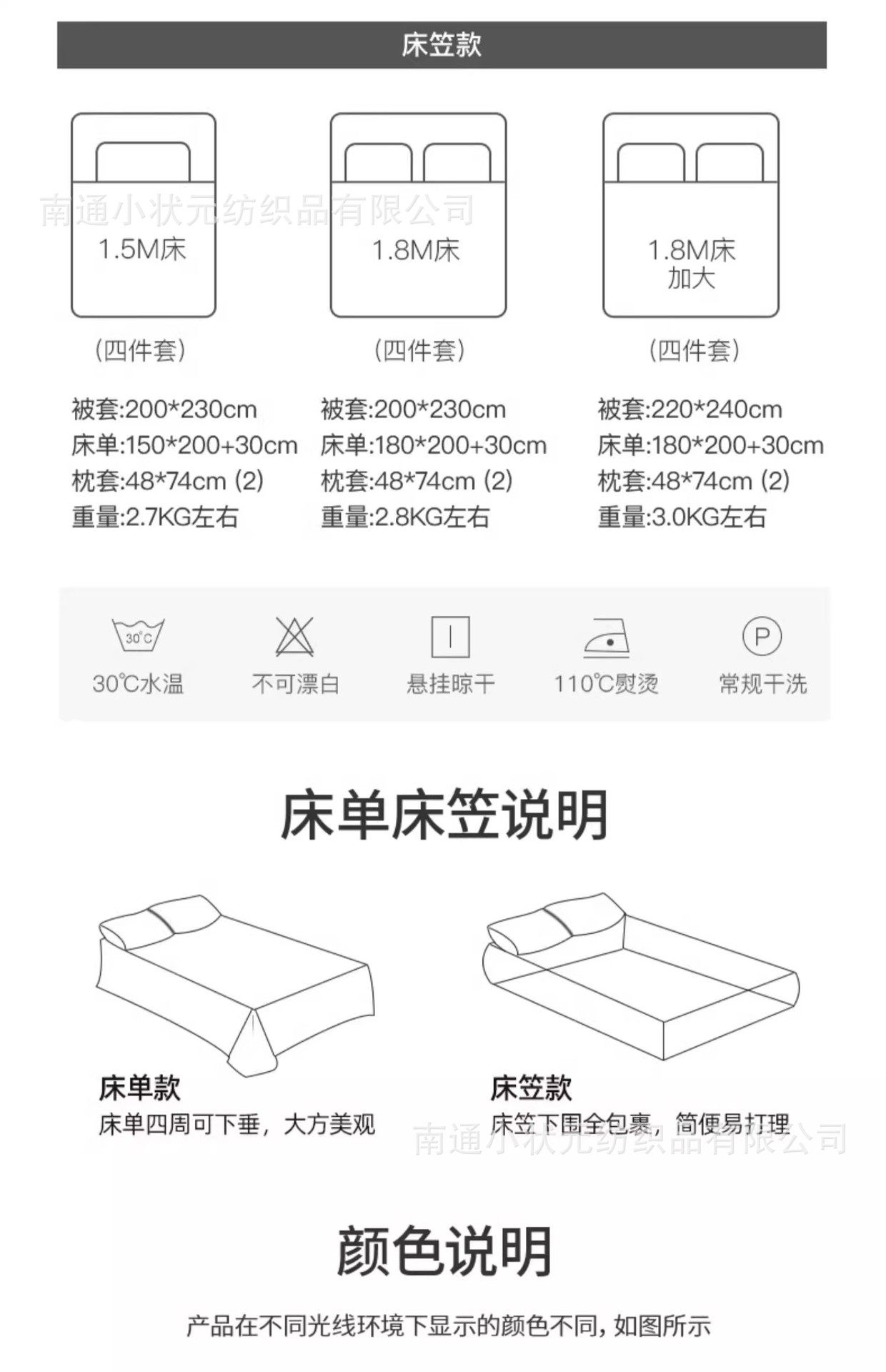 | Size specifications | 1.2m bed sheet (three-piece set) [applicable to 150*200cm quilt core],1.5m bed sheet (set of four) [applicable to 200*230cm quilt core],1.8m bed sheet (set of four) [applicable to 200*230cm quilt core],2.0m bed sheet (set of four) [applicable to 220*240cm quilt core],1.5m fitted sheet (set of four) [applicable to 200*230cm quilt core],1.8m fitted sheet (set of four) [applicable to 200*230cm quilt core],1.8m fitted sheet with extra large size (set of four) [applicable to 220*240cm quilt core] |