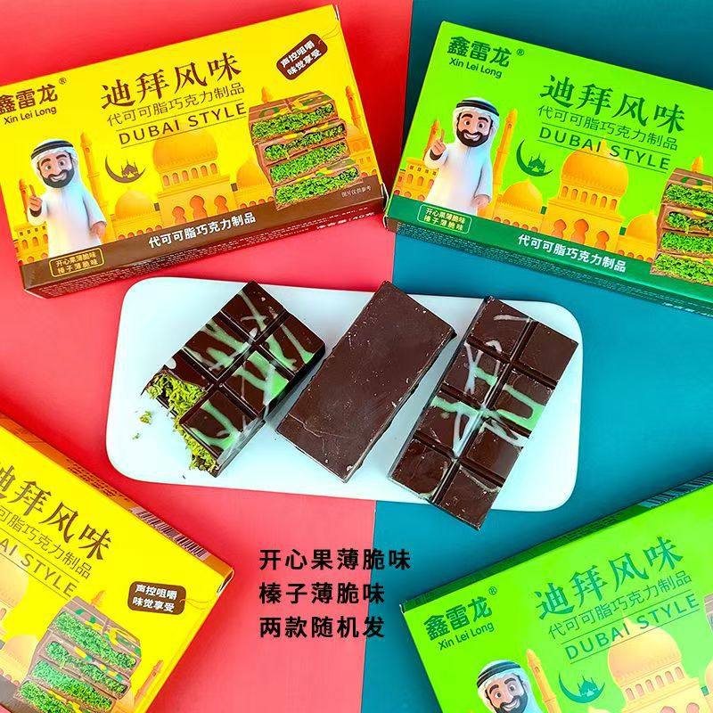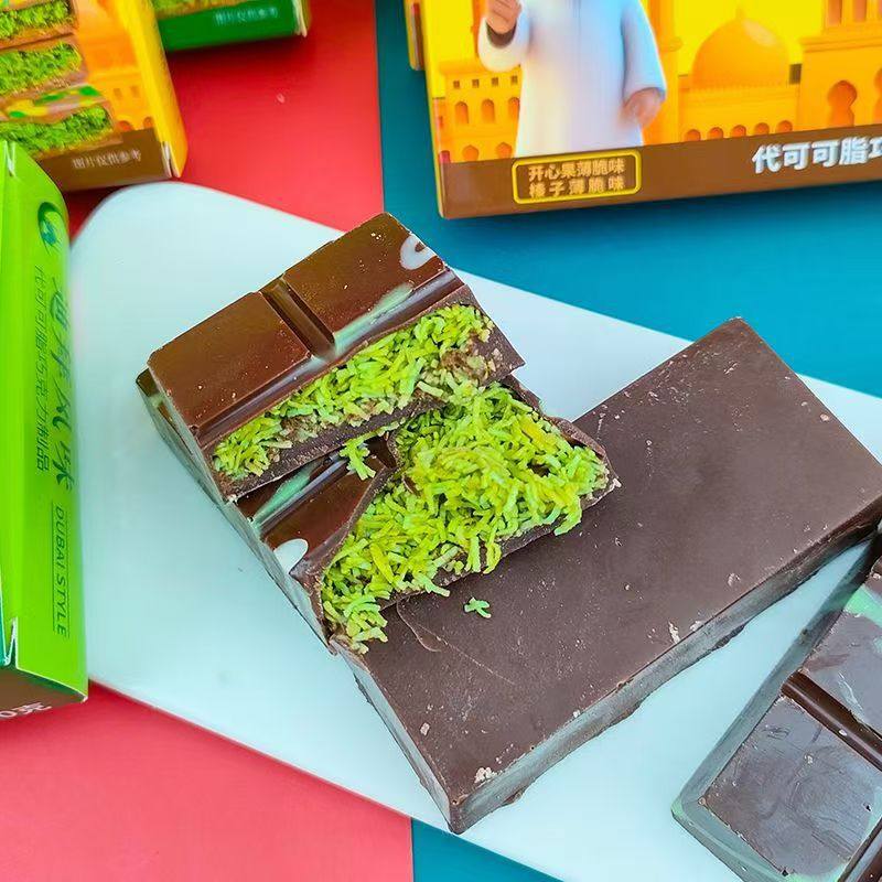 Dubai style chocolate pistachio hazelnut crispy sandwich voice control chewing cocoa butter substitute net red snacks