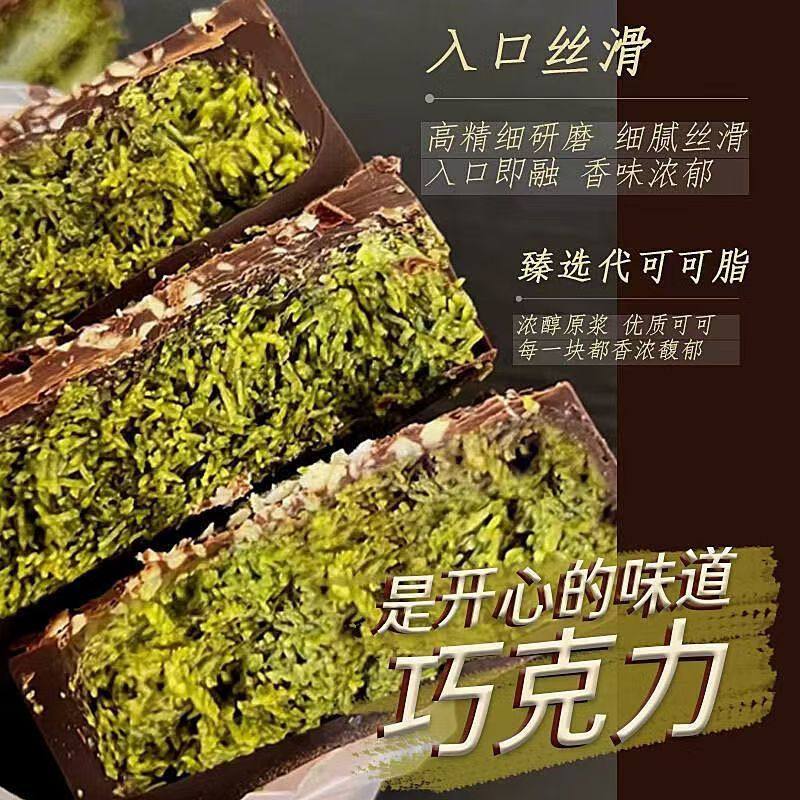 | Raw materials and ingredients | Cocoa butter substitute, white sugar, water-free glucose, whey powder, whole milk powder, maltodextrin, pistachios, water-free butter, cereal, bread silk, food addition |