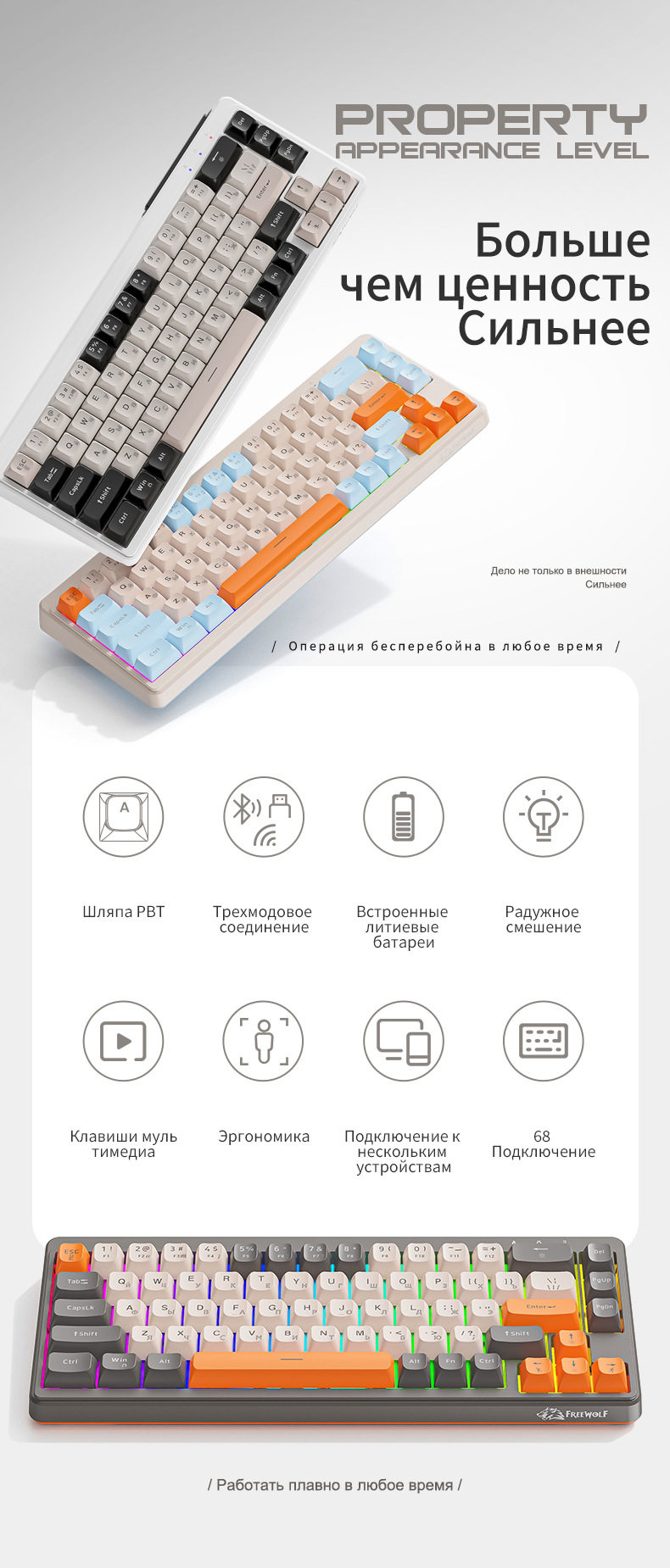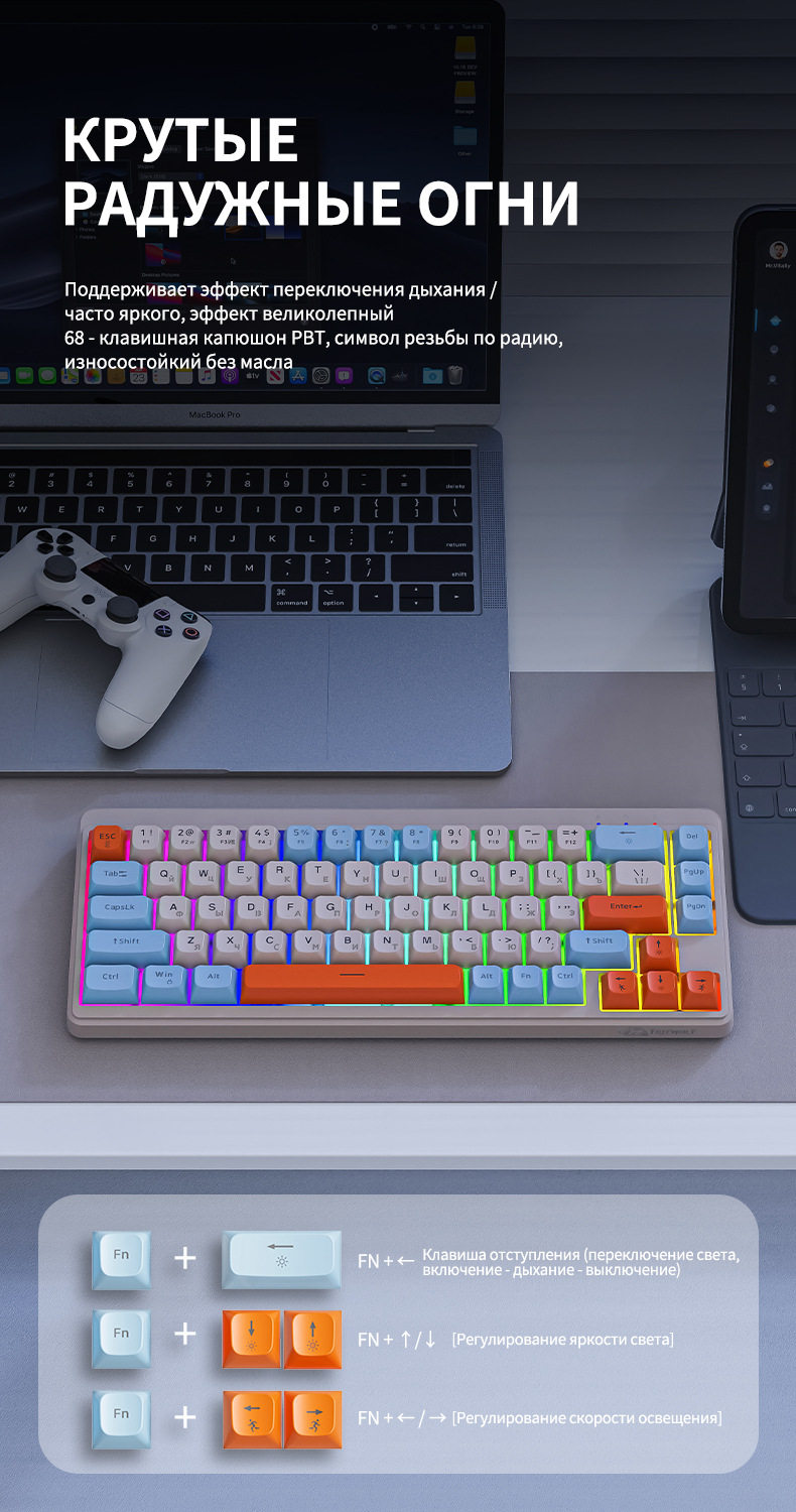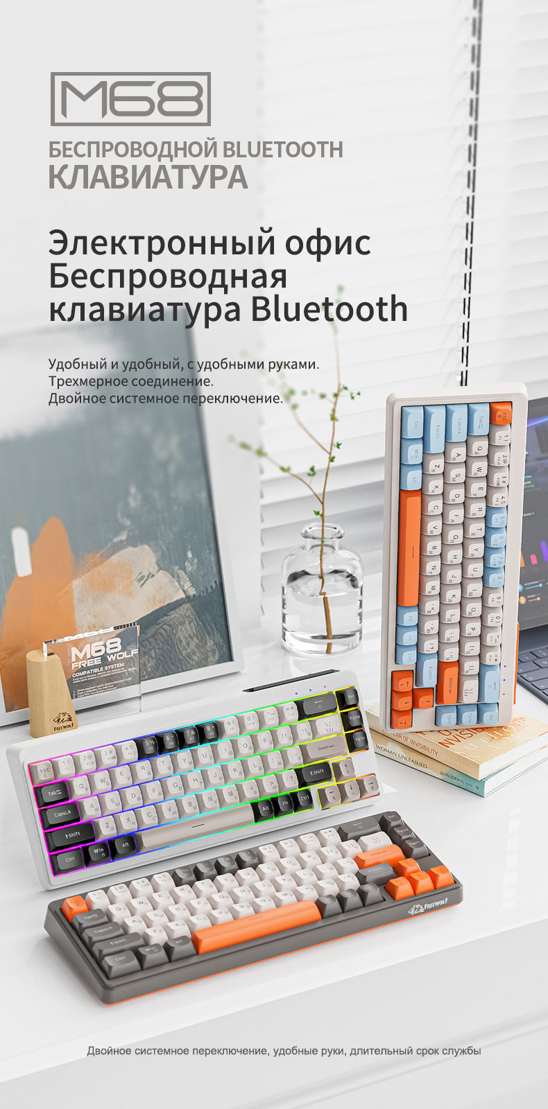 Free Wolf M68 Russian Wireless Bluetooth Three-Mode Mechanical Feel Russian Keyboard Game Silent Russian