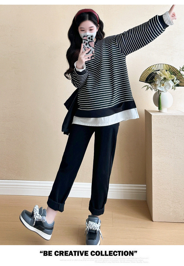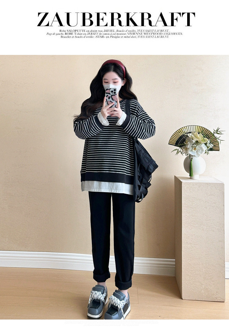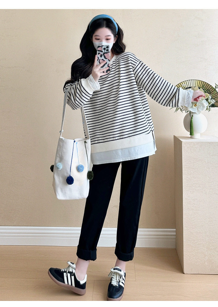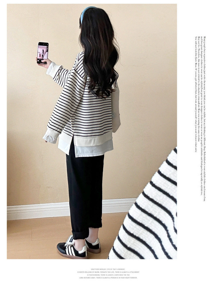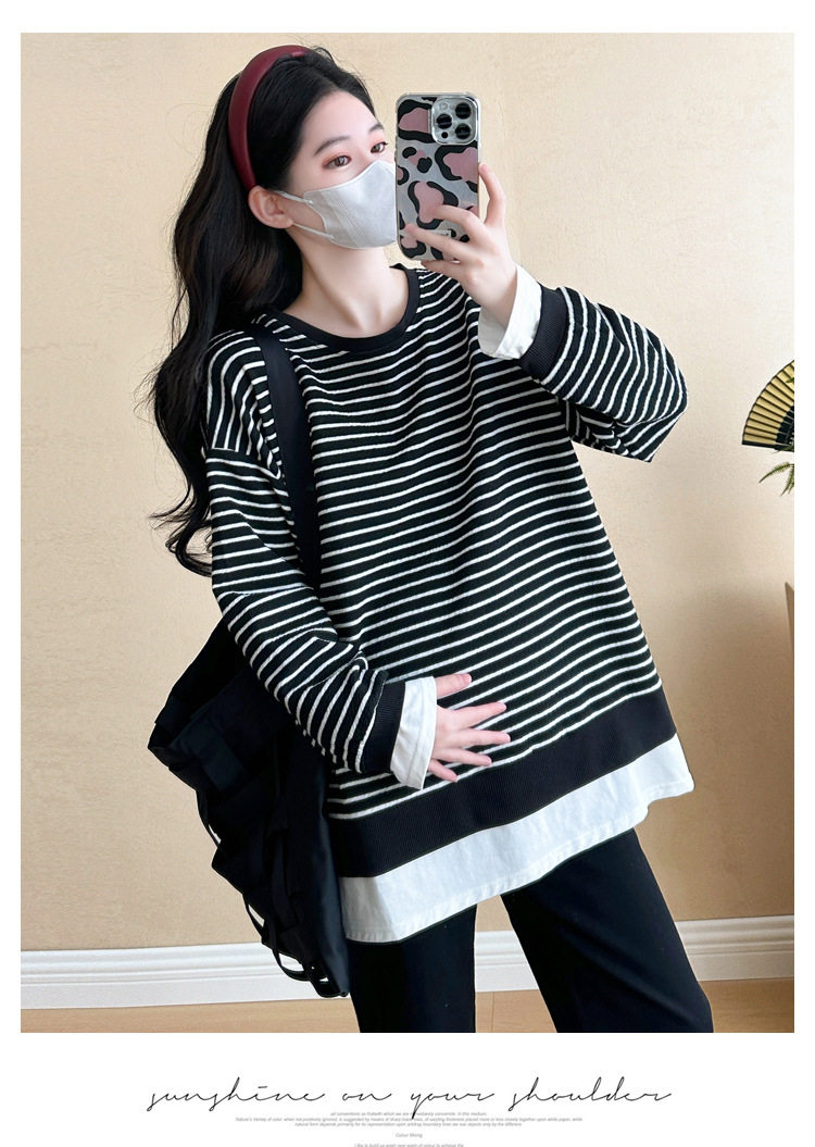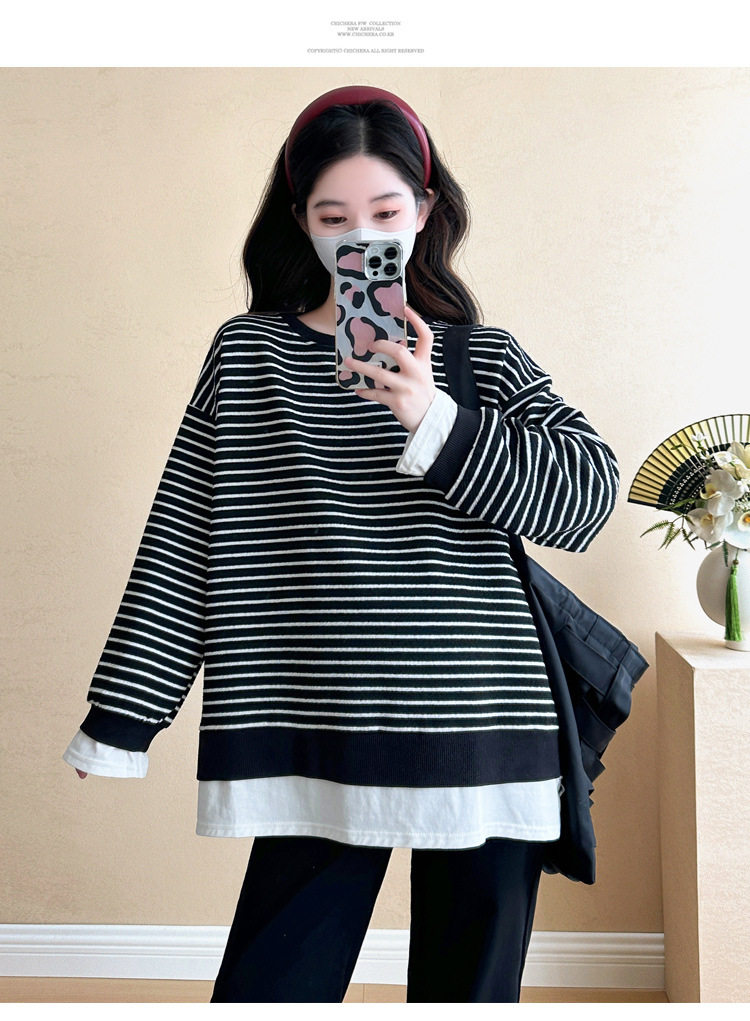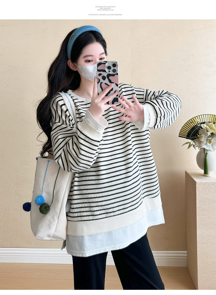 2024 New Pregnant Women Autumn and Winter Thickened Fake Two-piece Stripe Stitching Loose Casual T Sweater/Velvet Sweater