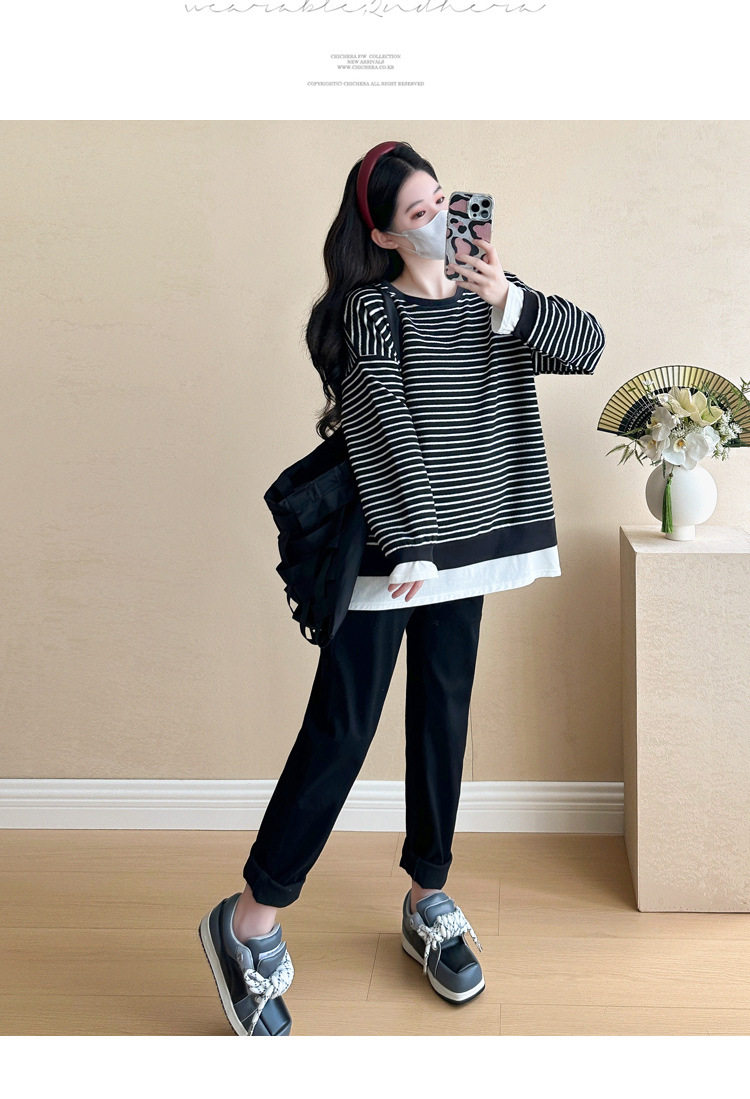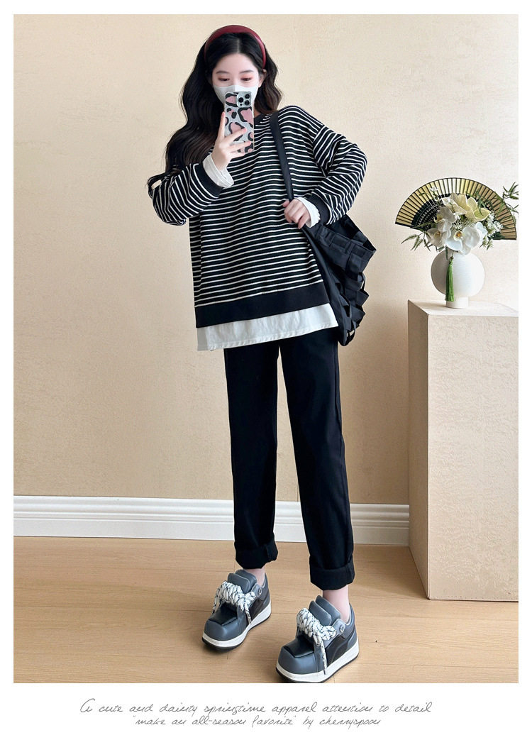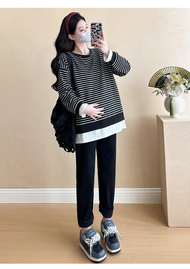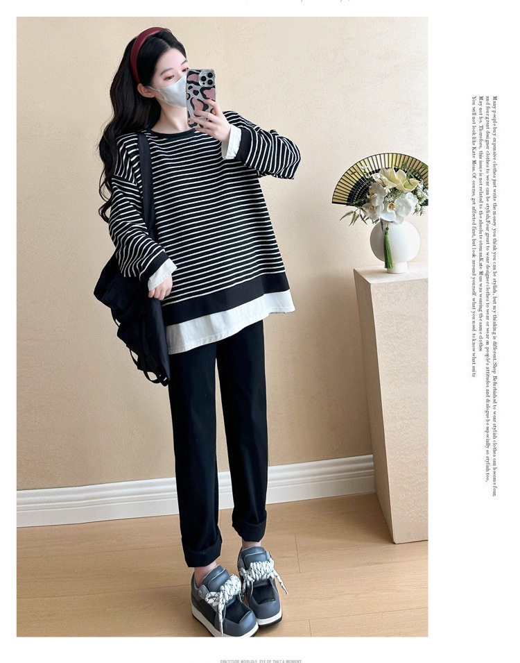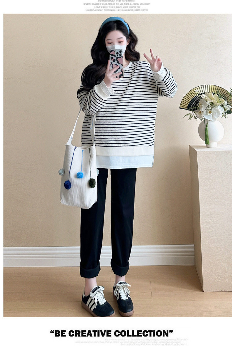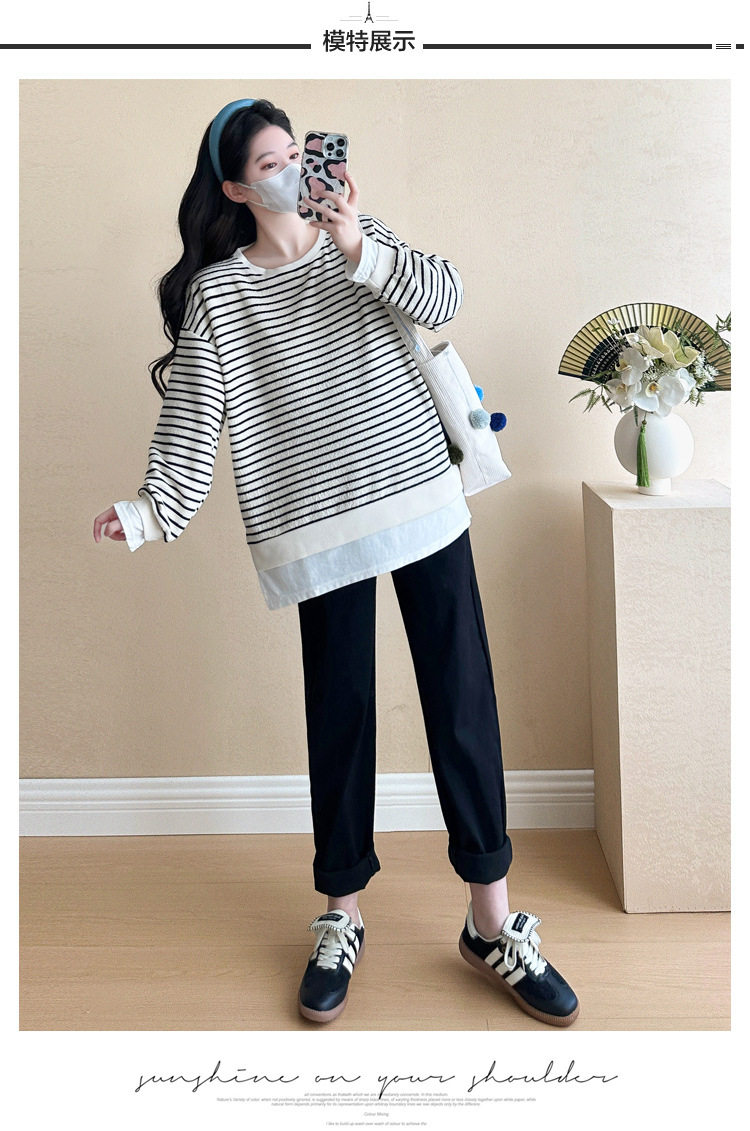 2024 New Pregnant Women Autumn and Winter Thickened Fake Two-piece Stripe Stitching Loose Casual T Sweater/Velvet Sweater