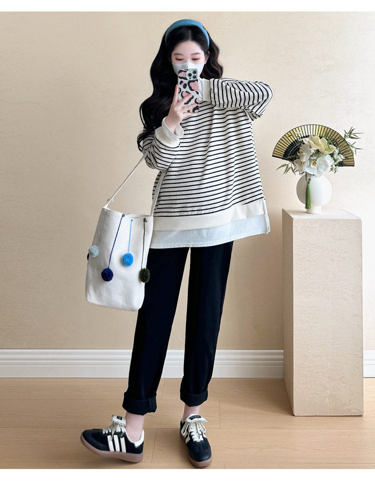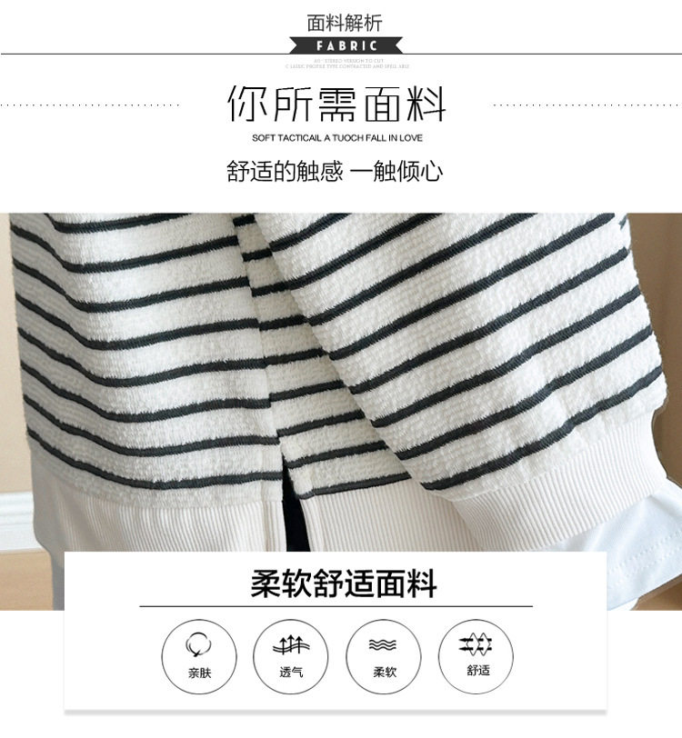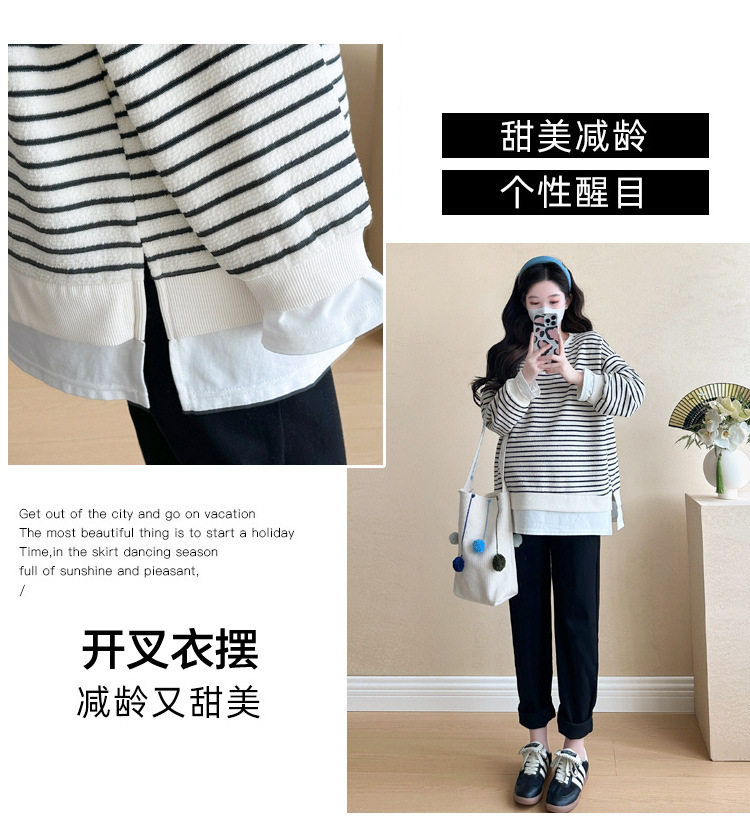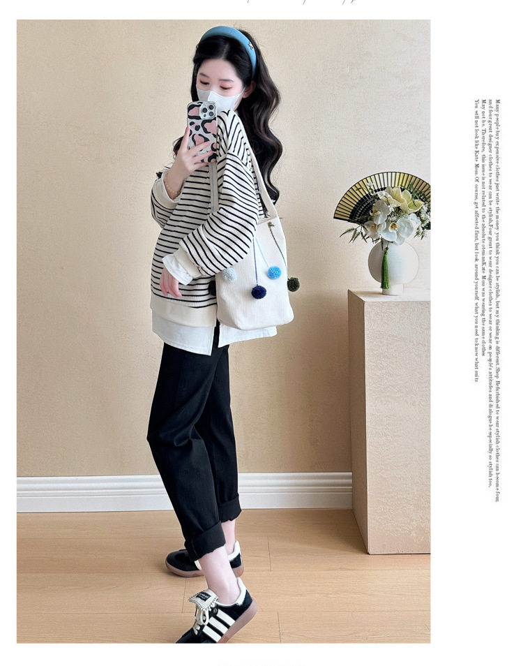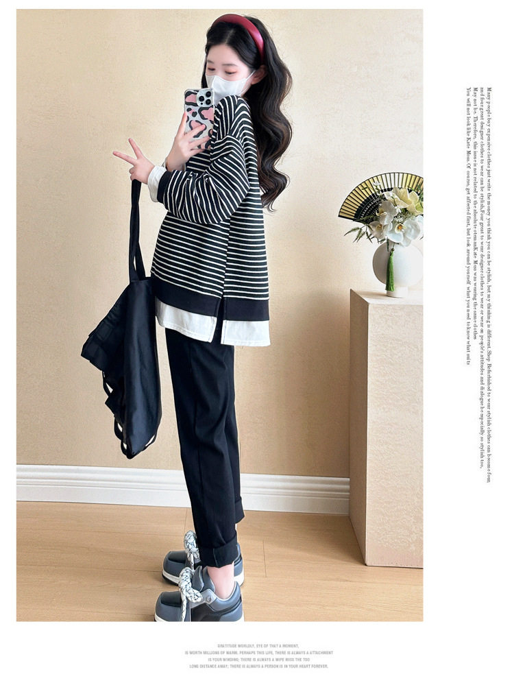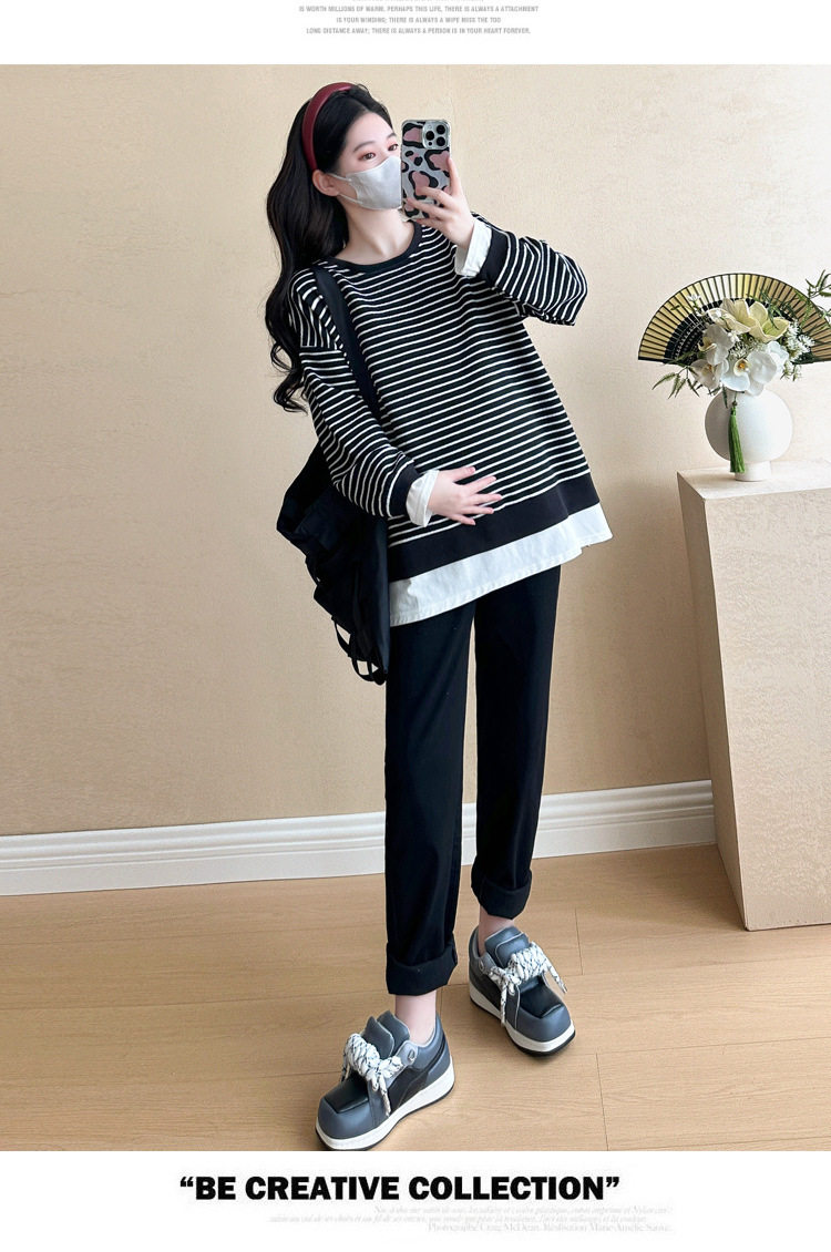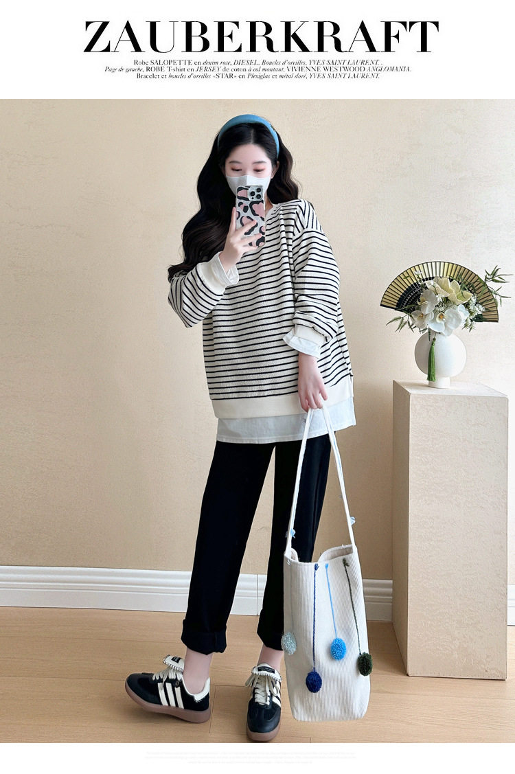 2024 New Pregnant Women Autumn and Winter Thickened Fake Two-piece Stripe Stitching Loose Casual T Sweater/Velvet Sweater