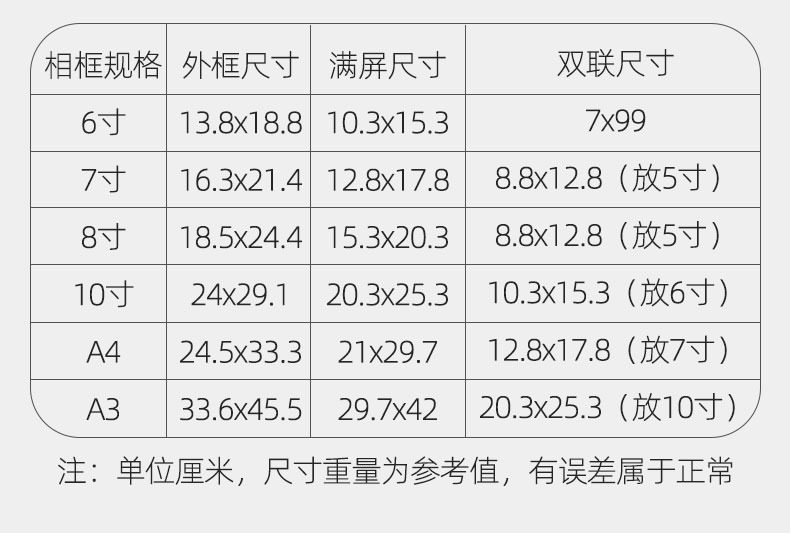 | Frame size | A 133.2cm inch 21*29.7cm,Installation 5inch inner pages 8.9*12.7cm,Installation 6inch inner pages 10.2 by 15.2cm,Installation 7inch inner pages 12.7 by 17.8cm,Installation 8inch the inner page is 15.2 by 20.3cm,Install 10inch inner pages 20 by 25cm,Install 12inch inner pages 25 by 30cm,Install a5 inner page 14.8 by 21cm,Install a3 inner page 29.7 by 42cm,Install 14inch the inner page is 25.5 by 35.5cm,The entire 8k inner page is 26.5 x 38cm,Large b5 size inner page 18.2 x 25.7cm,Installed 16 inches 30*40cm |