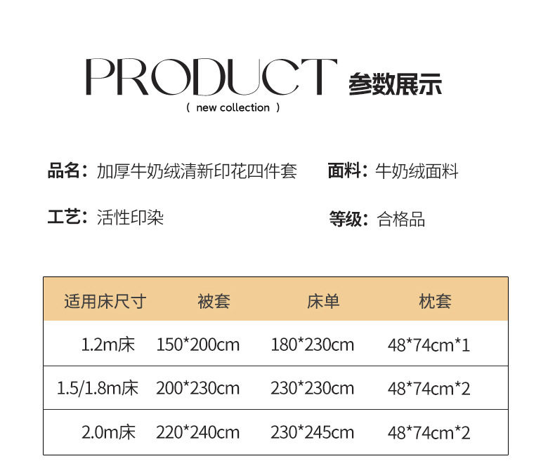 | Size specifications | 150*200cm-single quilt cover,180*220cm-single quilt cover,200*230cm-single quilt cover,220*240cm-single quilt cover,1.2m bed available [three-piece bed sheet set] suitable for quilt 150*200cm,1.5m bed/1.8m bed available [standard bed sheet set of four] suitable for quilt 200*230cm,2.0m bed available [four-piece set of enlarged bed sheets] suitable for quilts 220*240cm,1.5 fitted sheet set of four [fitted sheet 150x200cm] suitable for quilt 200*230cm,1.8 fitted sheet set of four [fitted sheet 180x200cm] suitable for quilt 200*230cm |