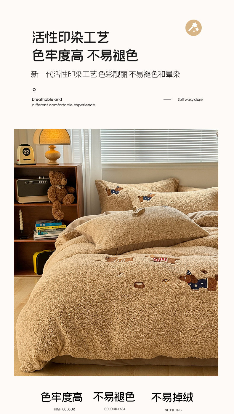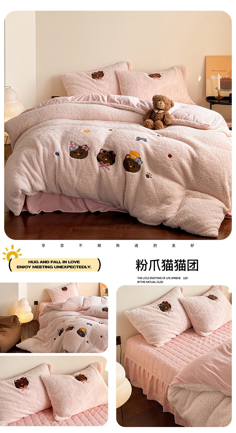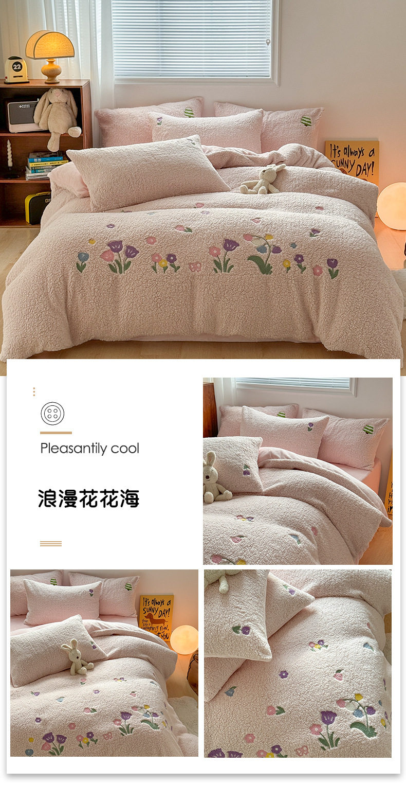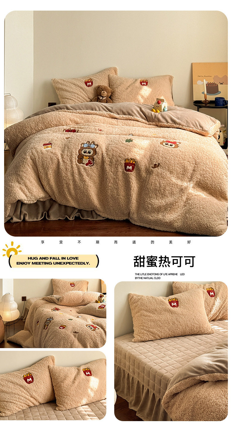 Lamb velvet four-piece set winter cartoon padded towel embroidered milk velvet sheets three-piece set wholesale embroidered quilt cover