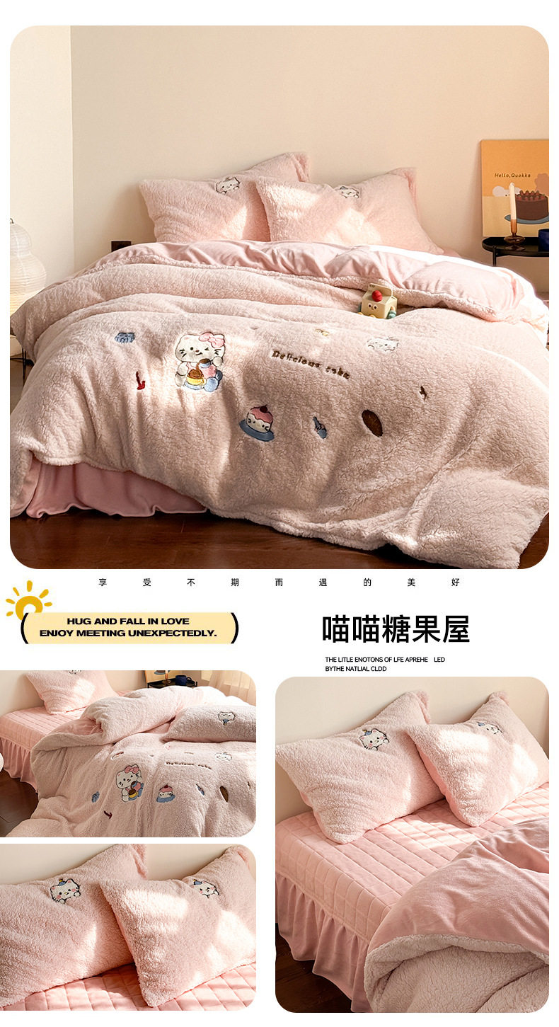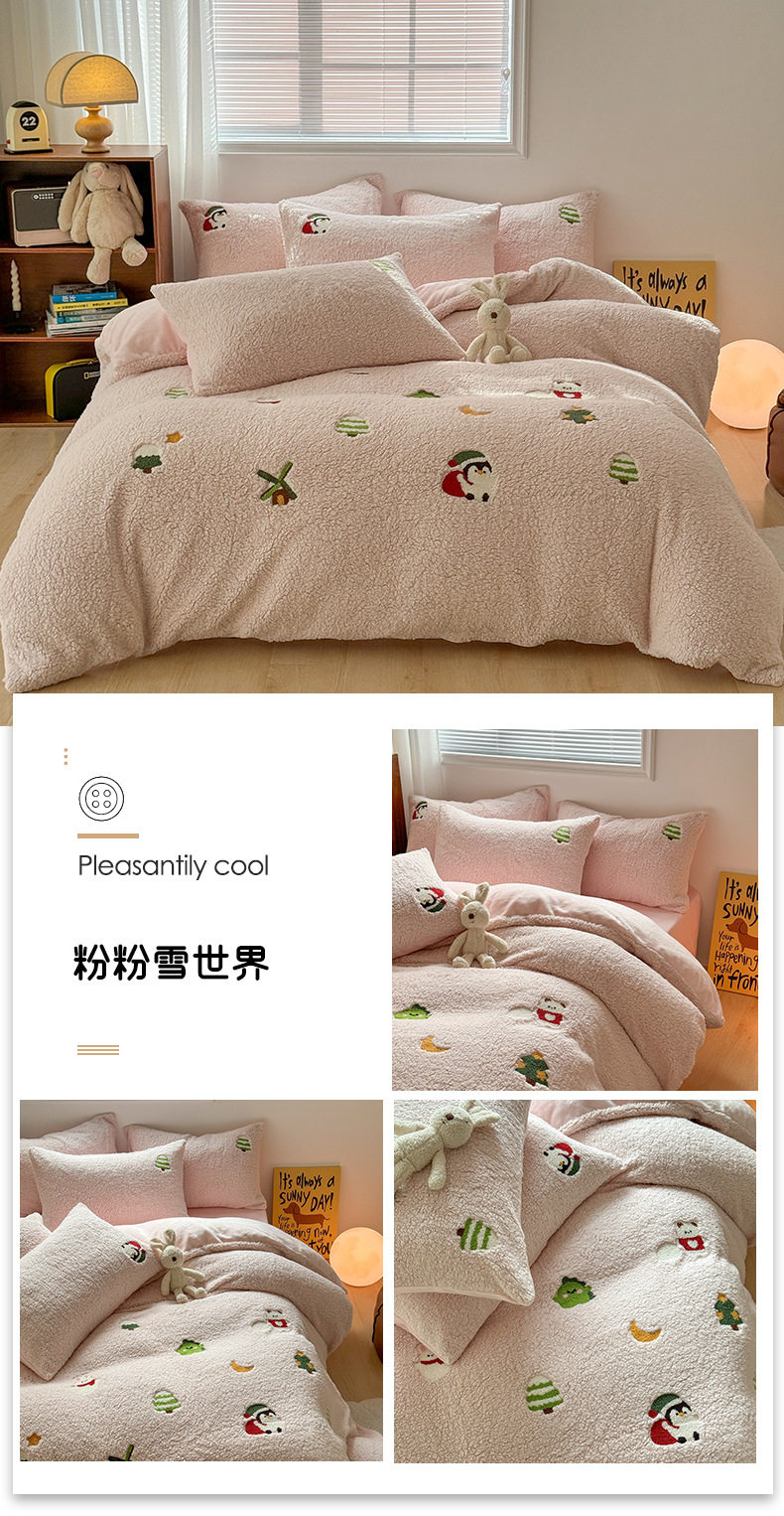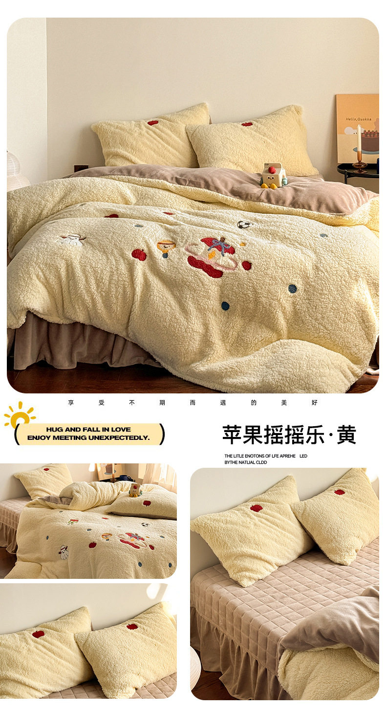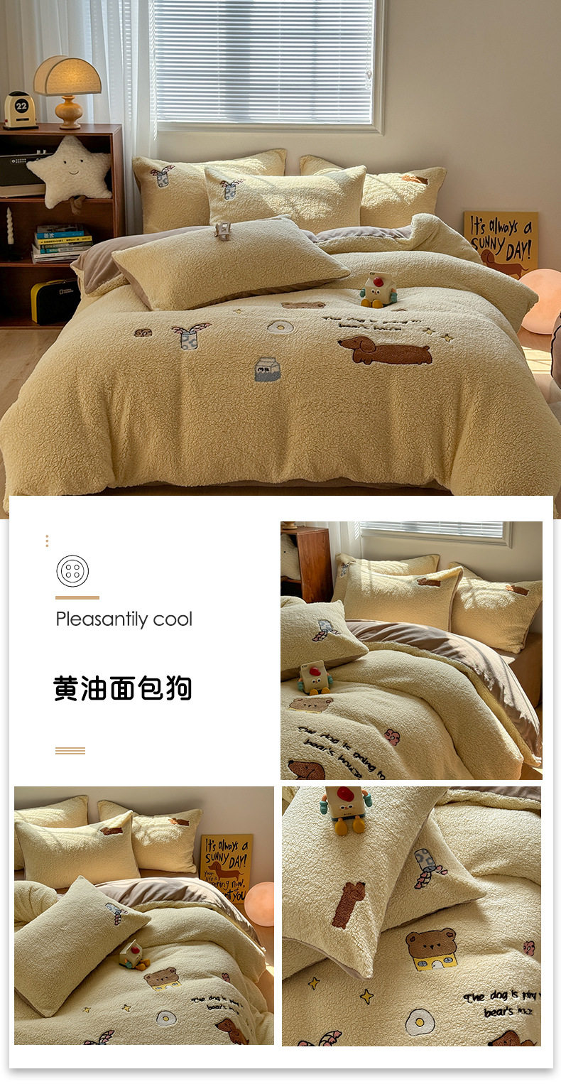 Lamb velvet four-piece set winter cartoon padded towel embroidered milk velvet sheets three-piece set wholesale embroidered quilt cover