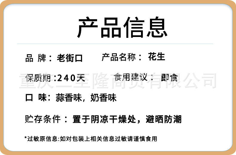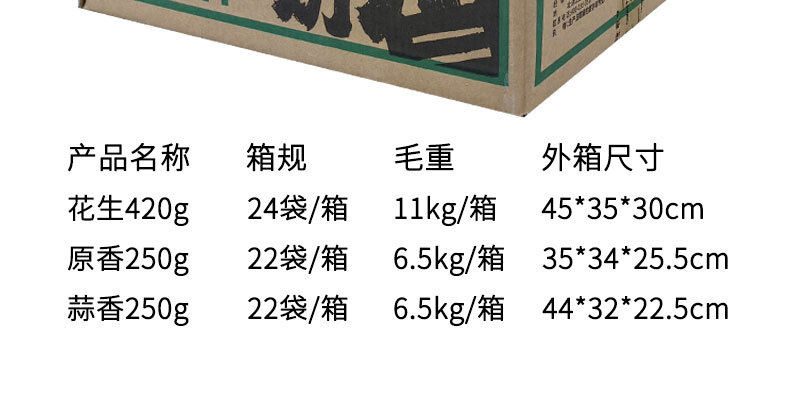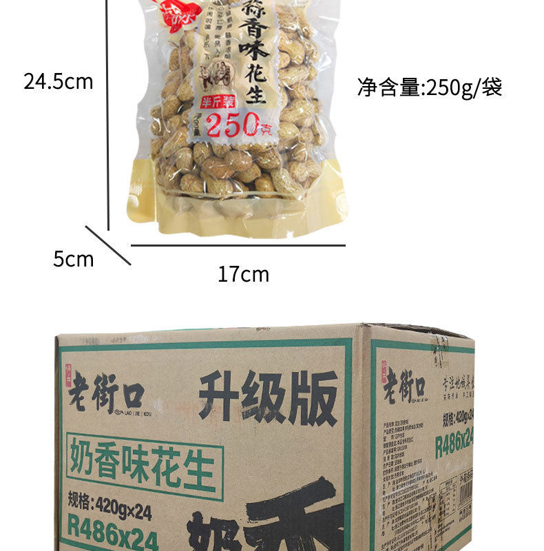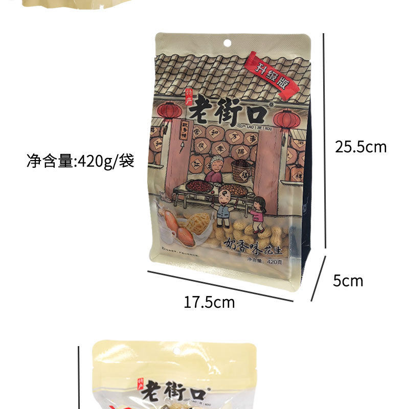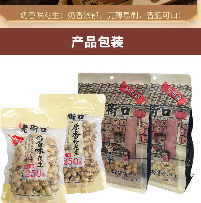 | Packaging specifications | Laojiekou original fragrant fried peanuts 250g,Old street garlic flavored peanuts 250g,Laojiekou peanuts 420g (garlic scent),Laojiekou peanuts 420g (milk flavor) |