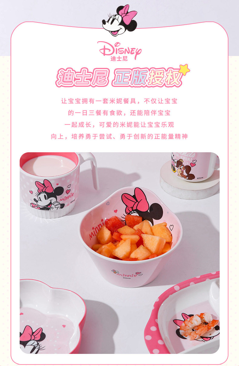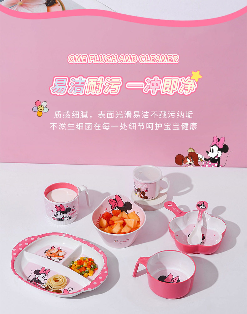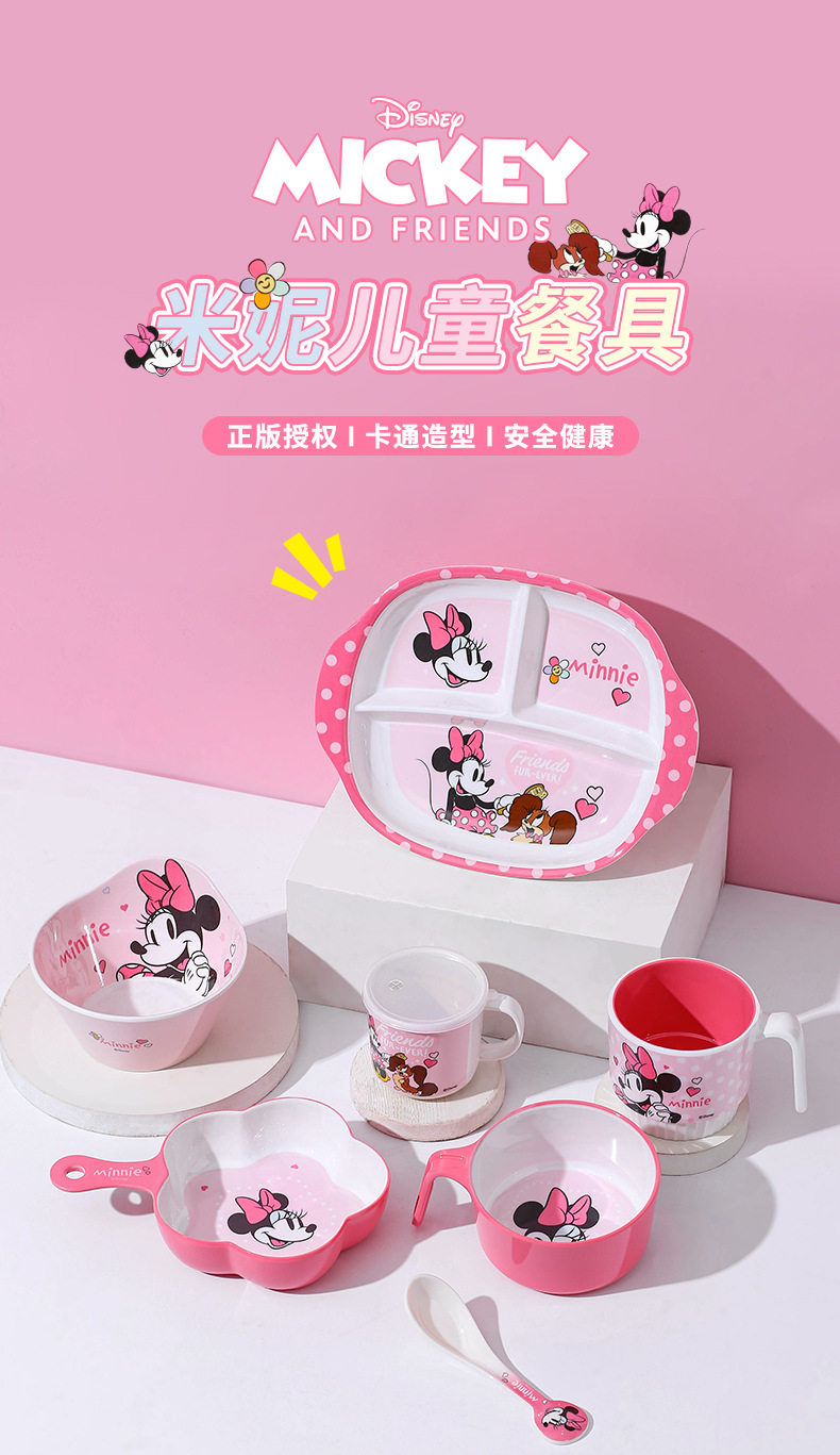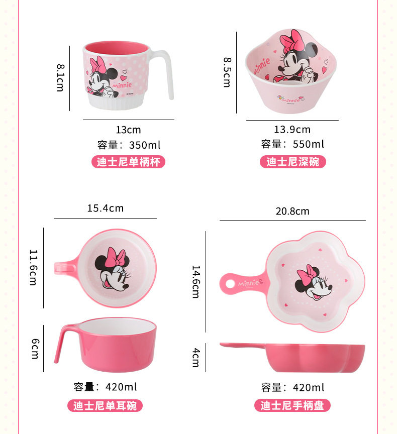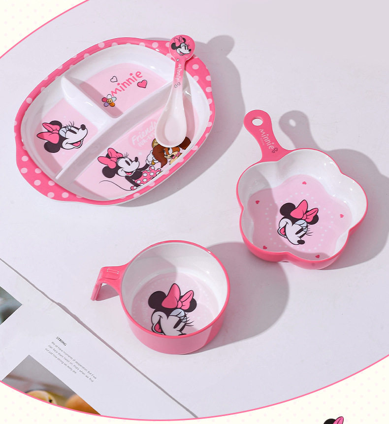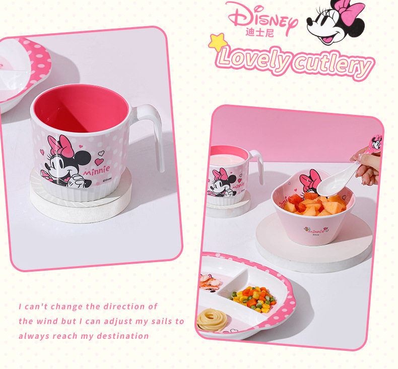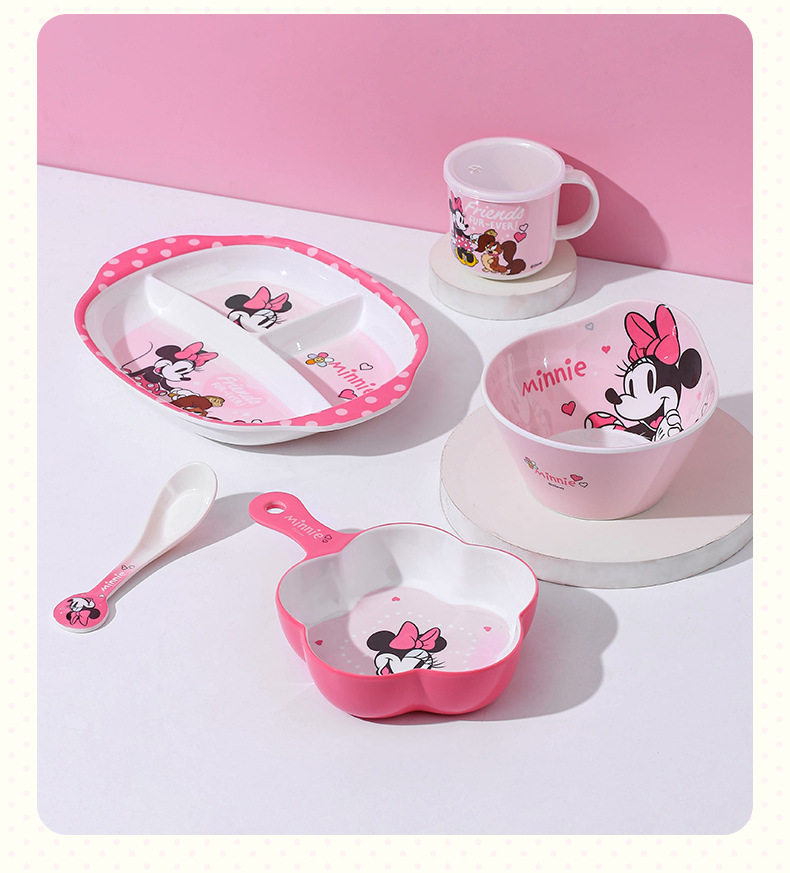 | Color | Minnie spoon,Minnie single handle bowl 400ml,Minnie deep bowl 550ml,Minnie flower-shaped bowl 400ml,Minnie single handle cup 350ml,Minnie single handle cup with lid 200ml,Minnie three grid dinner plate |