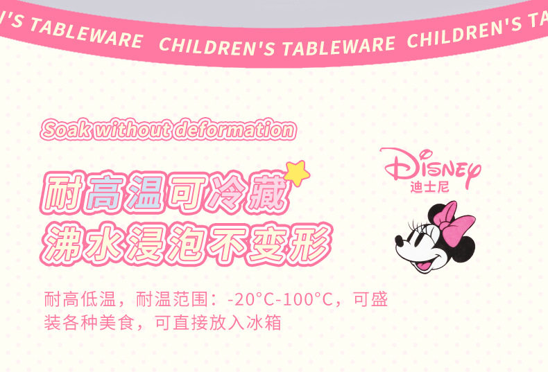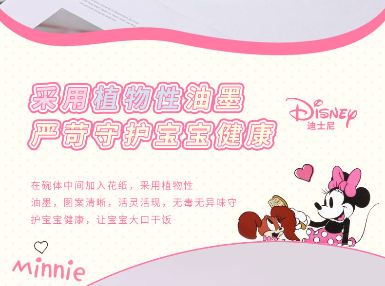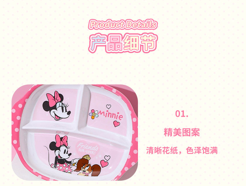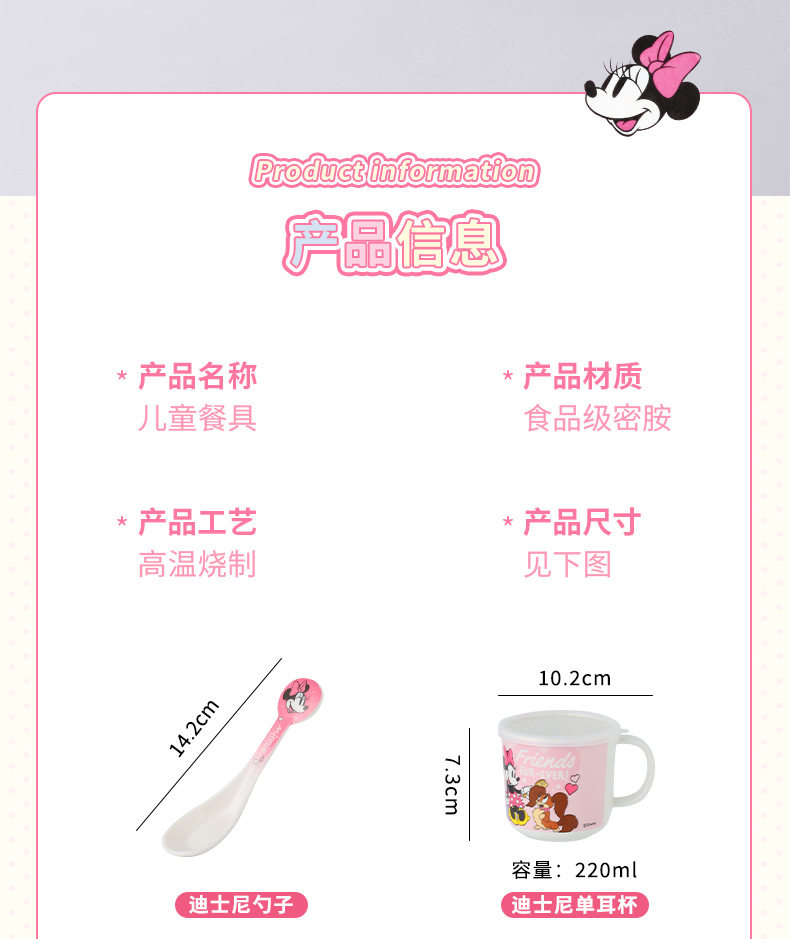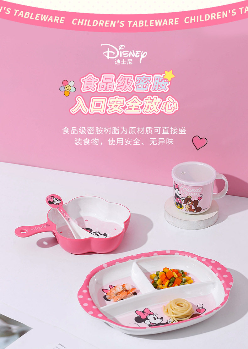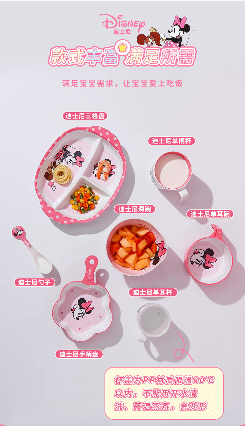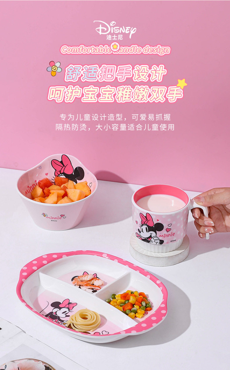 | Color | Minnie spoon,Minnie single handle bowl 400ml,Minnie deep bowl 550ml,Minnie flower-shaped bowl 400ml,Minnie single handle cup 350ml,Minnie single handle cup with lid 200ml,Minnie three grid dinner plate |