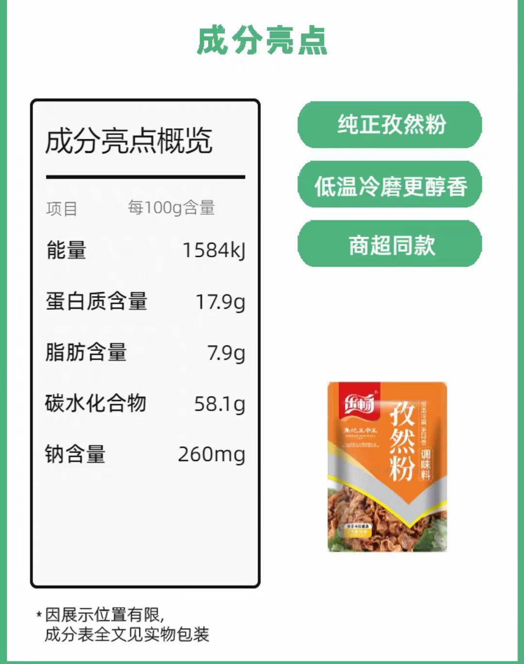 | Packaging specifications | Cumin powder 1*30g,White pepper powder 30g*1 generation,Black pepper powder 30g*1 generation,Delicious salt and pepper 35g*1 generation,Five spice powder 30g*1 generation,Chili powder 30g*1 generation,Chili slices 30g*1 generation,Steamed dumpling ingredients 30g*1 bag |