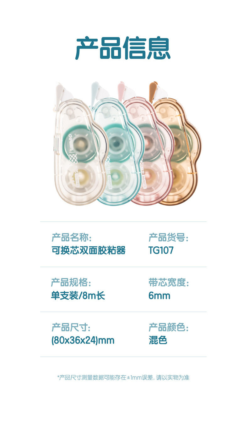 | Color | Tg107 replaceable core double-sided adhesive_6mm*8m (1 piece),Tg107tx double-sided adhesive refill (transparent color) (piece),Tg108 replaceable core double-sided adhesive_6mm*12m (piece),Tg108tx double-sided adhesive refill (transparent color) (piece) |