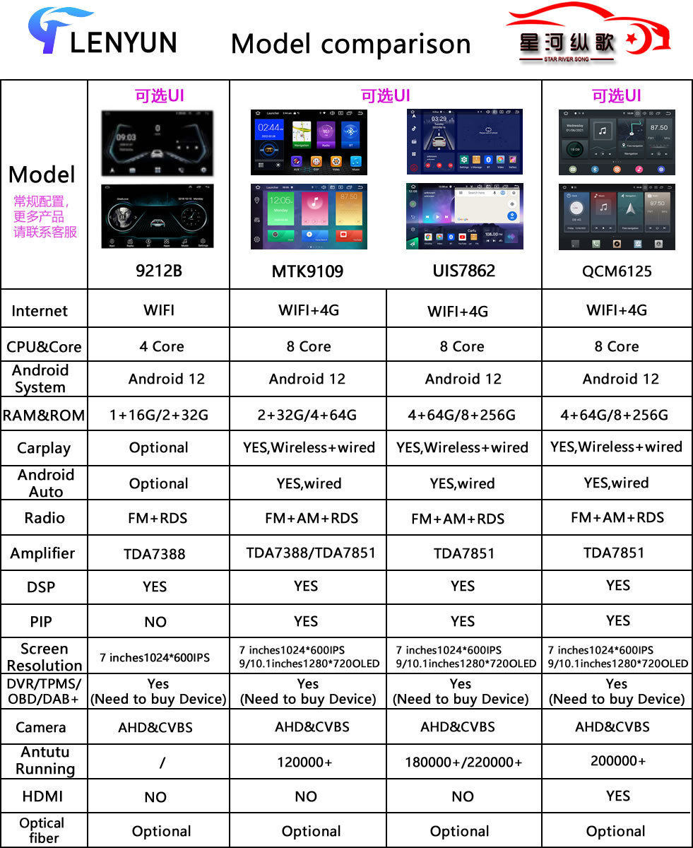 | Specifications | 4-core wifi version 2+32g with carplay,4-core wifi version 2+64g with carplay,8-core 4g version 4+64g with carplay,8-core 4g version uis8581 6+128g with carplay |