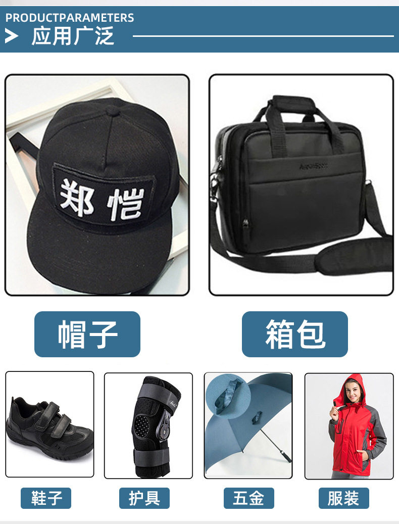 | Scope of application | Shoes,Protective gear,Packaging,Home,Backpack,Bags,Clothing,Jewelry,Home textile,Straps,Screen window,Clothing,Medical supplies,Moxibustion,Car seat,Driving recorder,Car floor mats,Camera storage,Industrial use,Waist protector,Back process,Other |