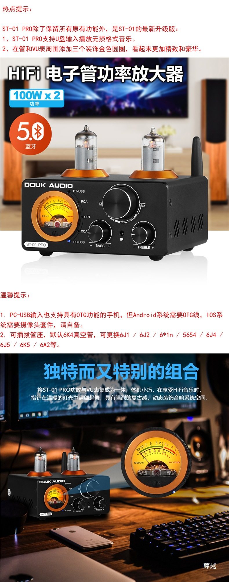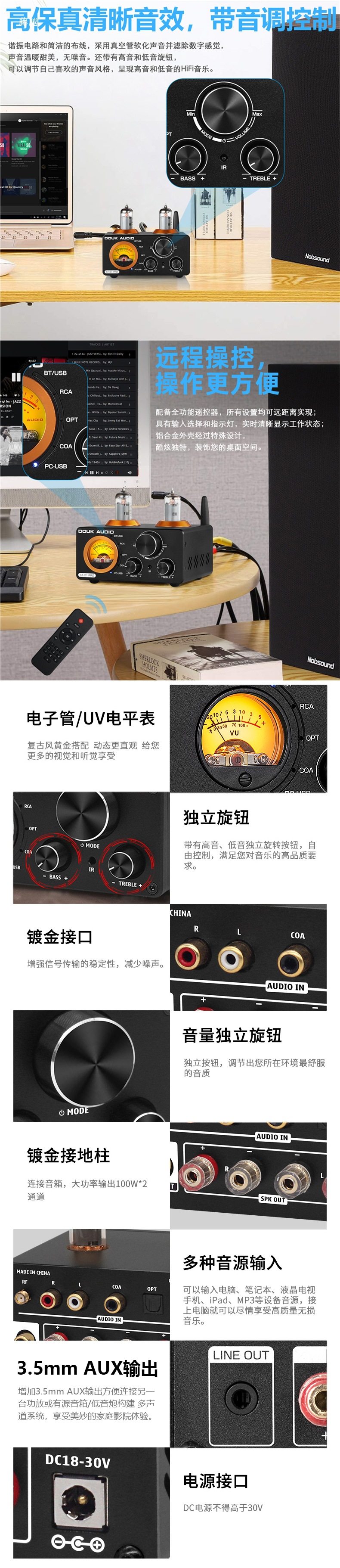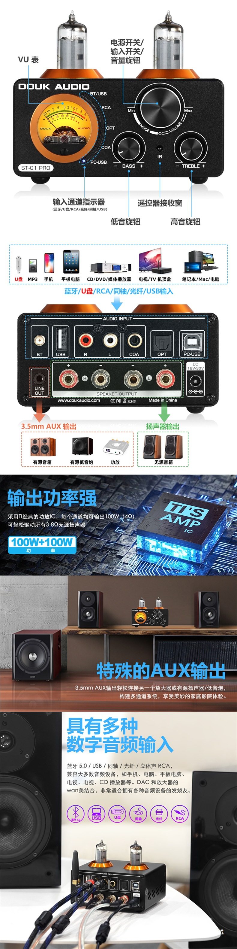 Bluetooth 5.0 Tube 200W Power Amplifier Fiber Optic Coaxial Computer USB U Disk Full Small Amplifier Vu Meter