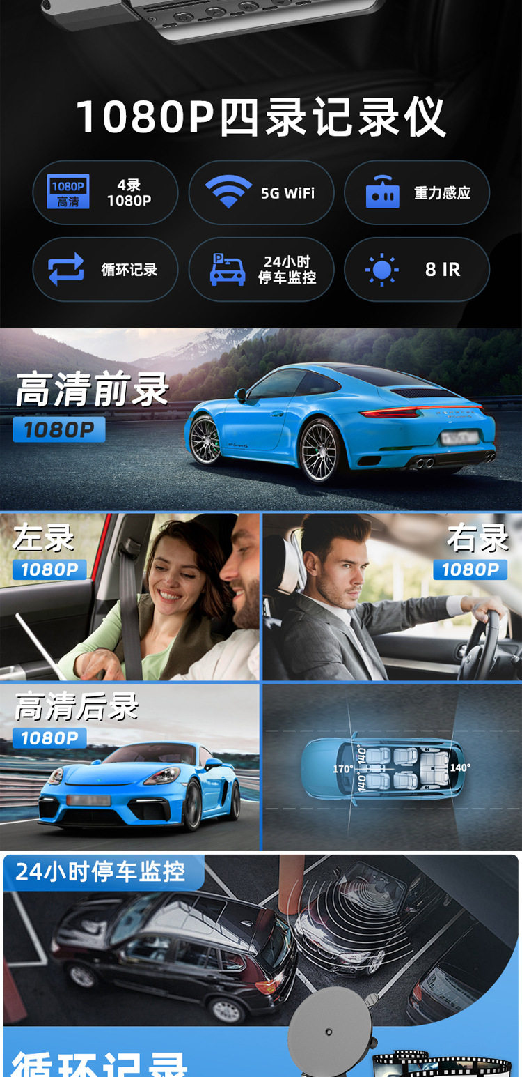 Cross-border four-record high-definition driving recorder infrared night vision night vision support mobile phone interconnection 24-hour parking monitoring