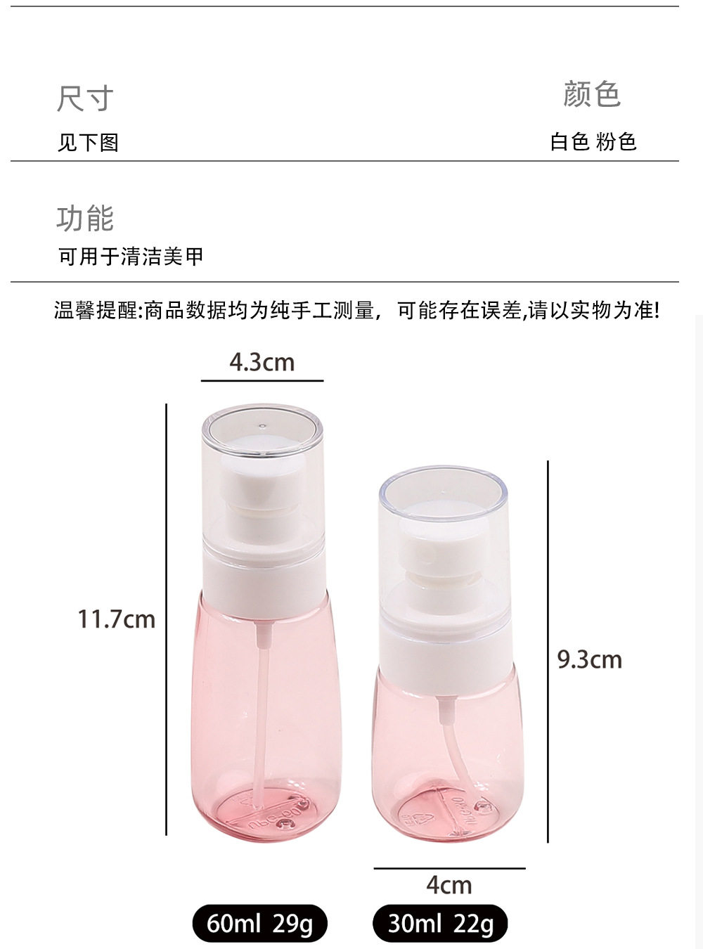 | Specifications | Pink 30ml spray bottle-1pc,Pink 60ml spray bottle-1pc,White 30ml spray bottle-1pc,White 60ml spray bottle-1pc |