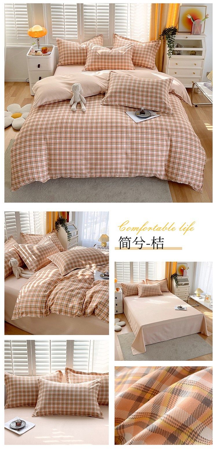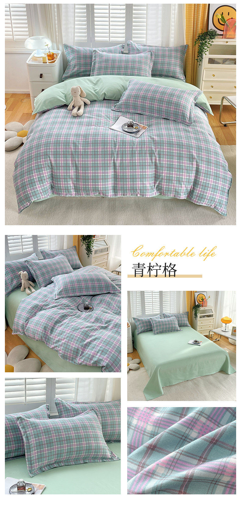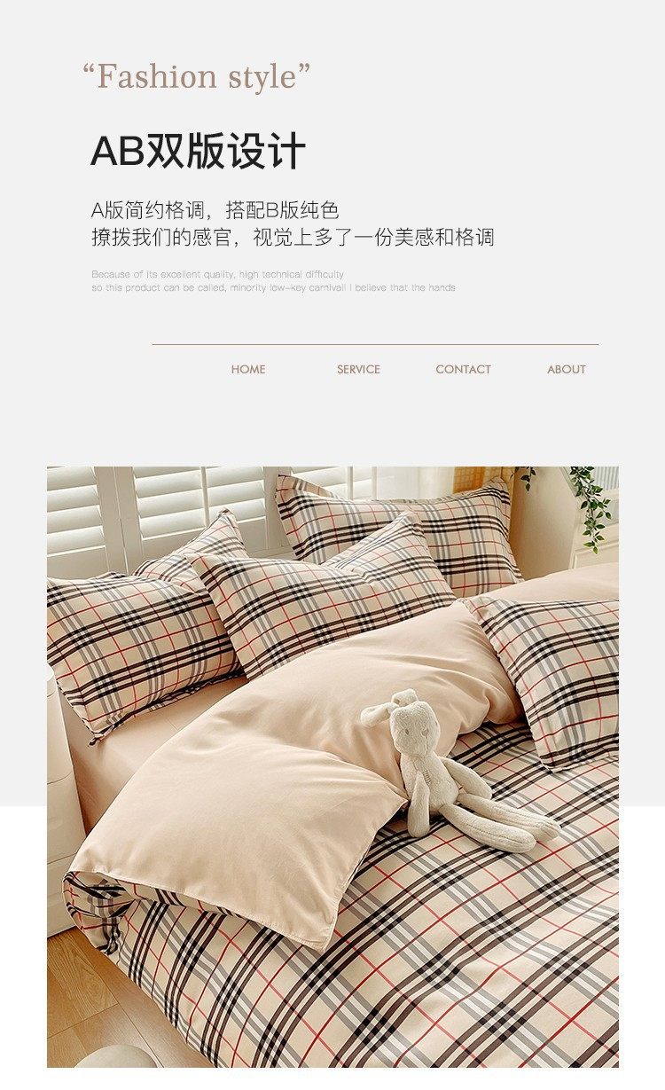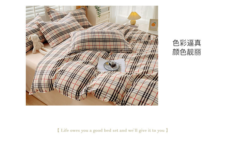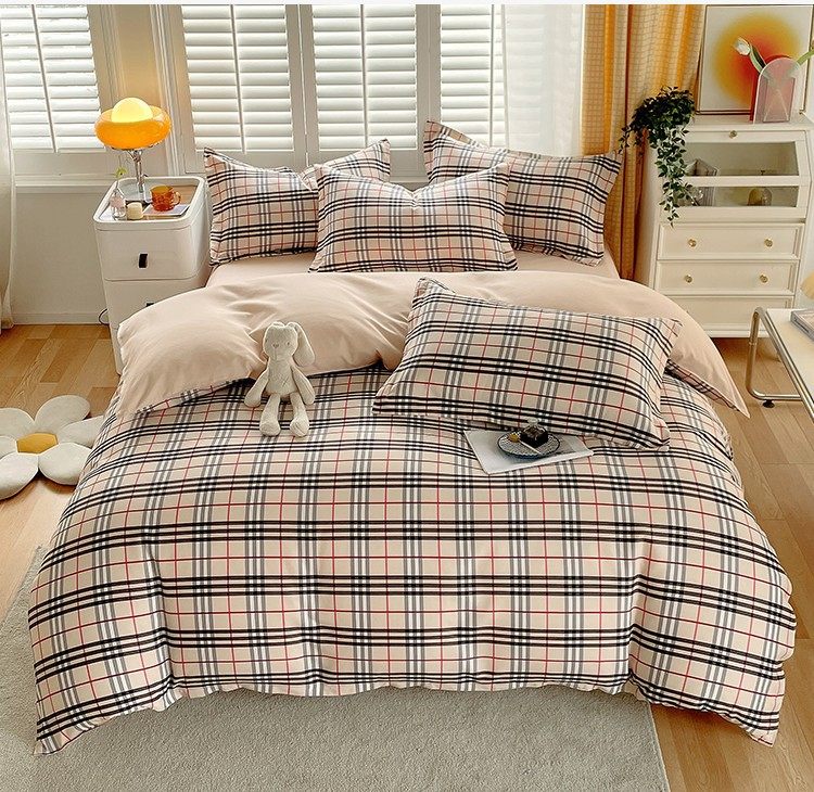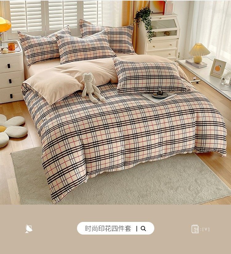 New Thickened Sanding Four-piece Solid Color Plaid Autumn and Winter Japanese Washed Cotton Student Dormitory Bed Sheet Three-piece Set