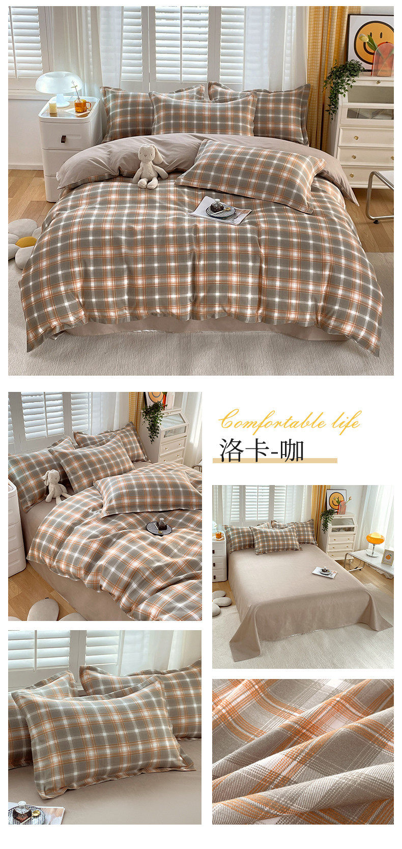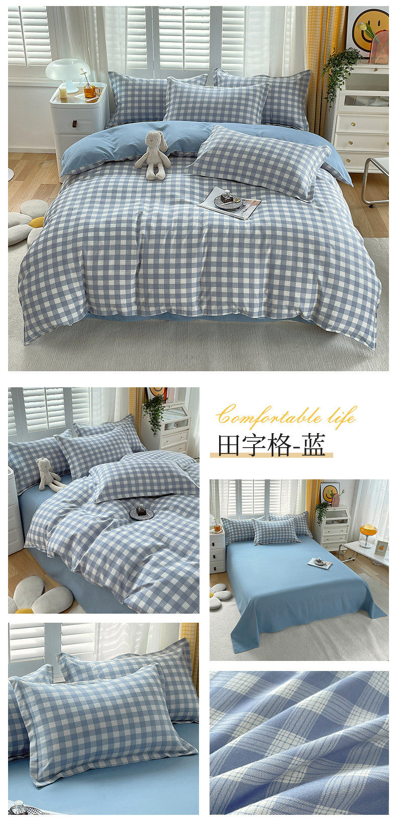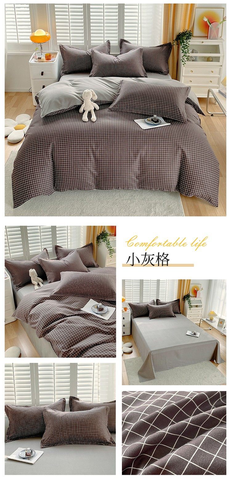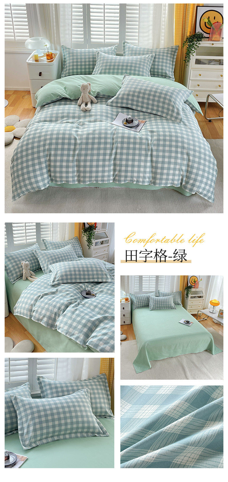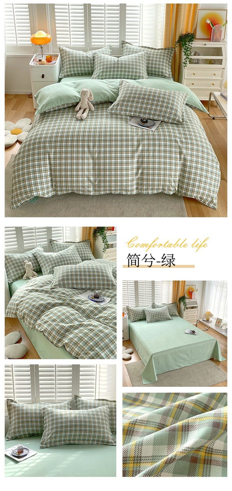 New Thickened Sanding Four-piece Solid Color Plaid Autumn and Winter Japanese Washed Cotton Student Dormitory Bed Sheet Three-piece Set
