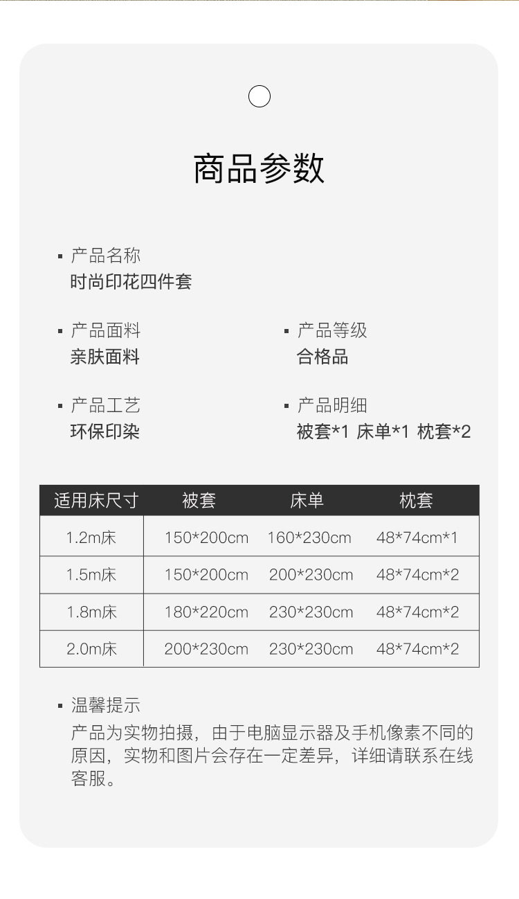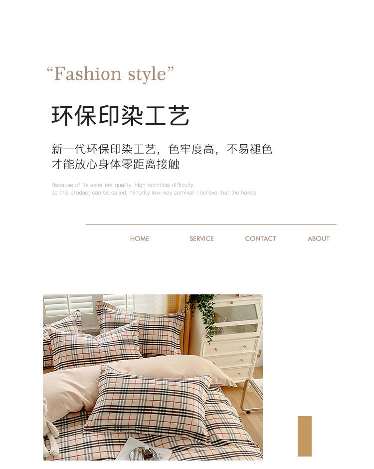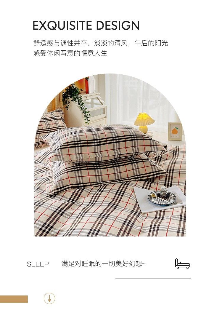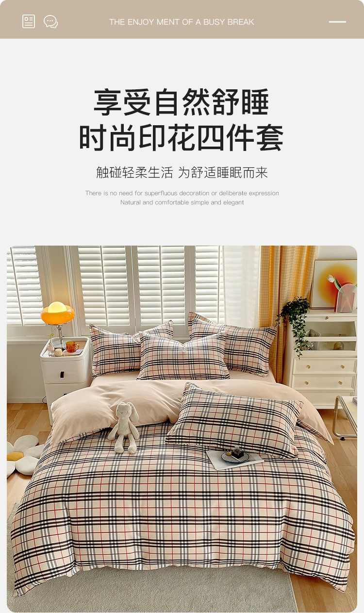 | Size specifications | 1.2m bed sheet three-piece set [quilt cover 150*200],1.5 bed sheet four-piece set [quilt cover 150*200],1.8 bed sheet four-piece set [quilt cover 180*220],2.0 bed sheet four-piece set [quilt cover 200*230],2.2 four-piece bed sheet set [quilt cover 220*240] |