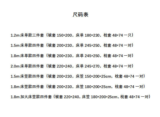 | Dimensions | 1.2m bed sheet three-piece set (quilt cover 150*200, bed sheet 180*230),1.5m bed sheet four-piece set (quilt cover 200*230, bed sheet 245*250),1.8m bed sheet four-piece set (quilt cover 200*230, bed sheet 245*250),2.0mbed sheets four-piece set (quilt cover 220*240, bed sheets 245*270),1.5m fitted sheet set of four (quilt cover 200*230, fitted sheet 150*200*25cm),1.8m fitted sheet set of four (quilt cover 200*230, fitted sheet 180*200*25cm),1.8m extra large fitted sheet set of four (quilt cover 220*240, fitted sheet 180*200*25cm) |