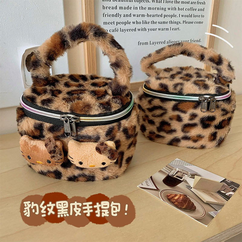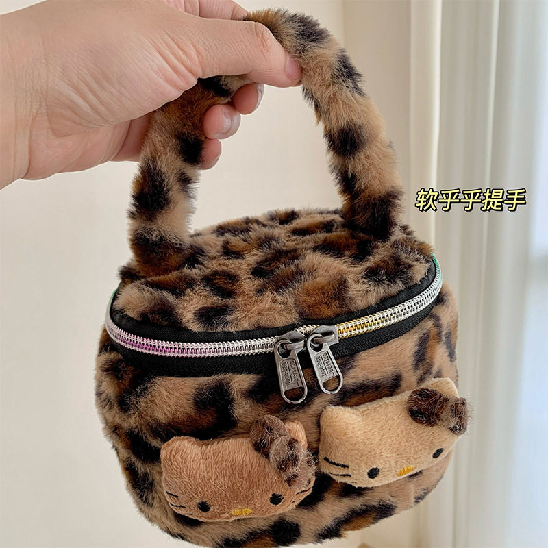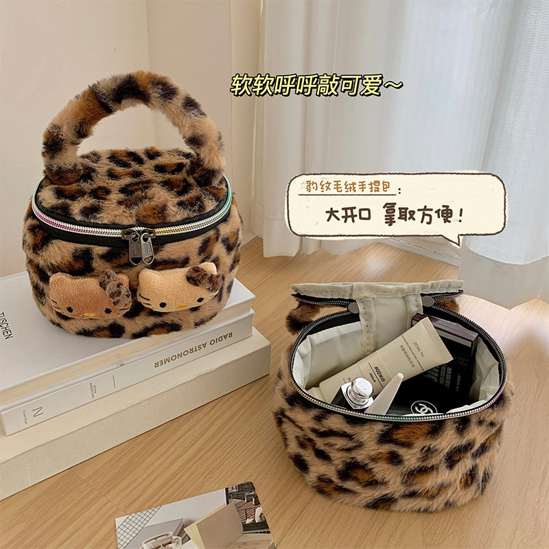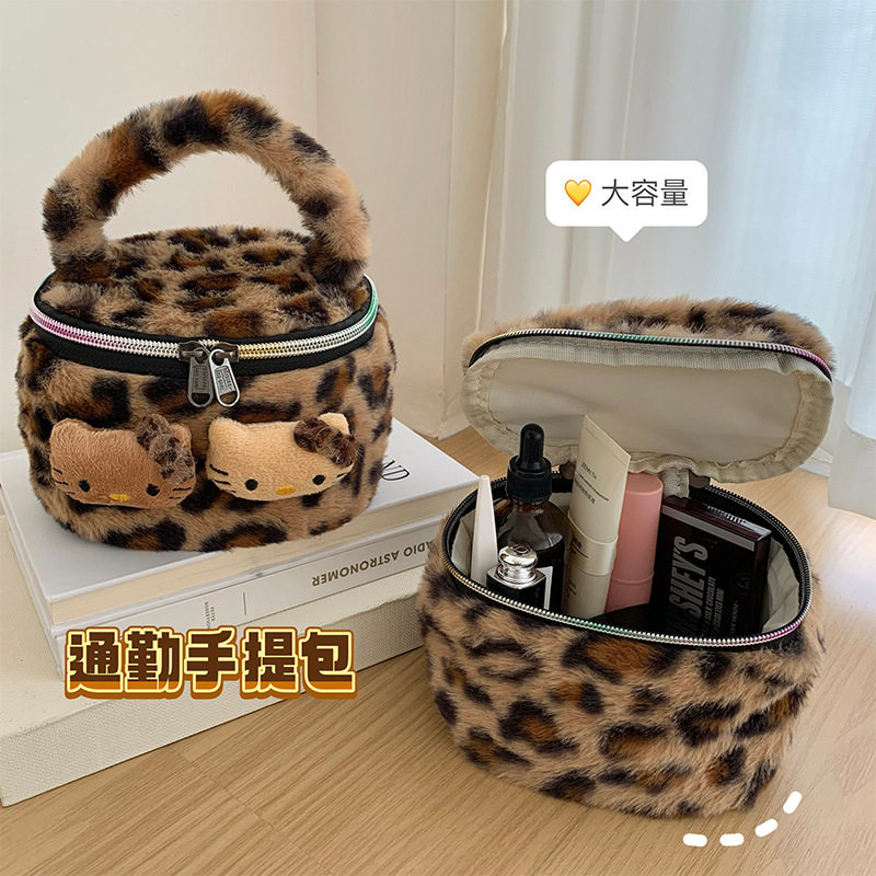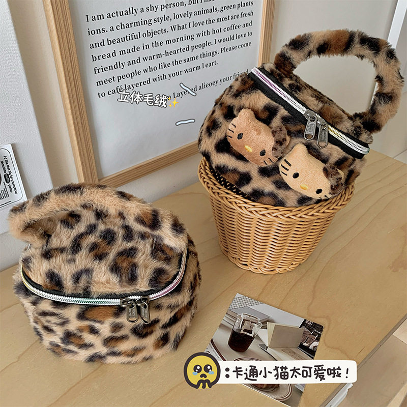 Ins Style Cute Leopard Print Cat Plush Portable Cosmetic Bag Women's Portable Travel Skincare Wash Bag Storage Bag
