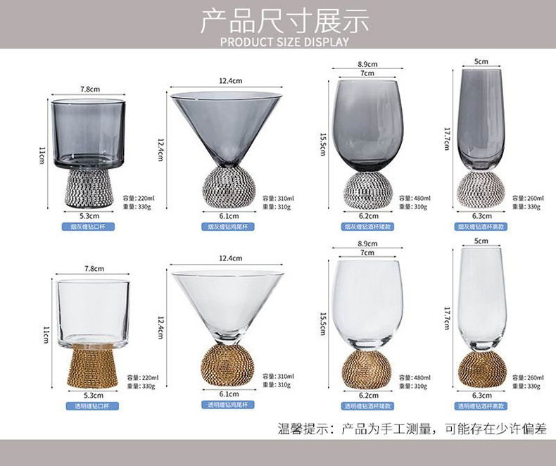 | Color | Transparent color-tail cup 310ml-gold diamond,Transparent color-red wine glass 480ml-gold diamond,Transparent color-champagne glass 260ml-gold diamond,Transparent color-tail cup 310ml-silver diamond,Transparent color-red wine glass 480ml-silver diamond,Transparent color-champagne glass 260ml-silver diamond,Smoke gray-tail cup 310ml-silver diamond,Smoke gray-red wine glass 480ml-silver diamond,Smoke gray-champagne glass 260ml-silver diamond,Amber-tail cup 310ml-gold diamond,Amber-red wine glass 480ml-gold diamond,Amber-champagne glass 260ml-gold diamond,Pink-tail cup 310ml-silver diamond,Pink-red wine glass 480ml-silver diamond,Pink-champagne glass 260ml-silver diamond,Champagne glass without diamonds,Red wine glass without diamonds,Cocktail glass without diamonds,Transparent color-champagne glass (second grade) 260ml,Transparent color-red wine glass (second grade) 480ml |
